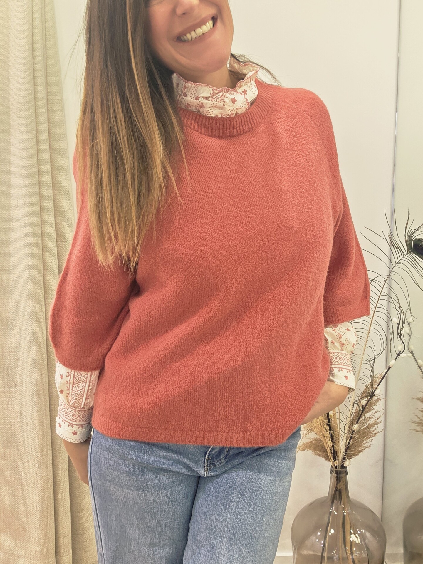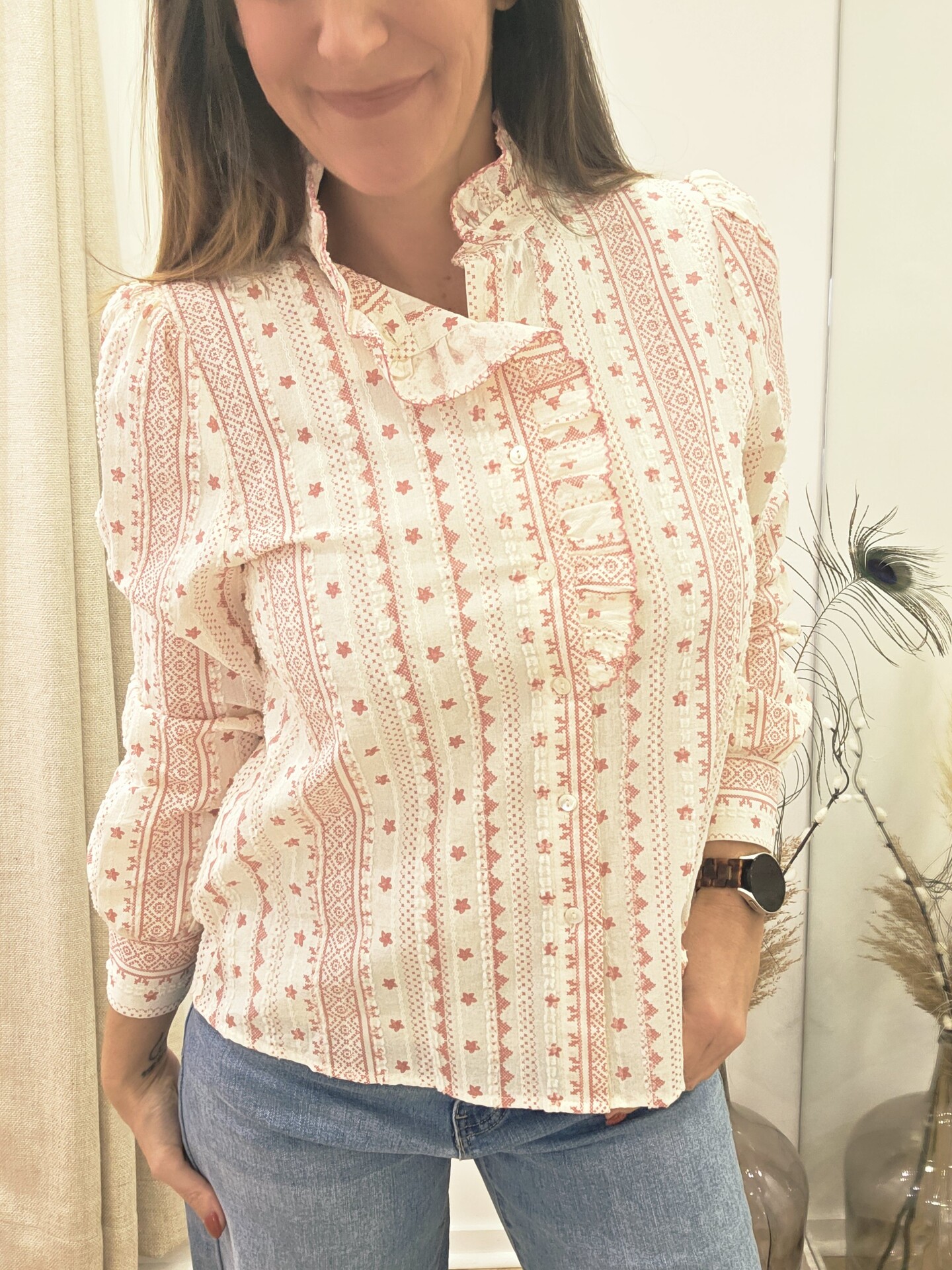 Son tissu 100 % viscose est doux et agréable à porter. L’imprimé rose délicat, associé au col volanté et à la patte de boutonnage décorée de petits volants, crée une silhouette raffinée sans en faire trop. Sur les photos, je la porte en taille S, associée au pull COTTI et au jean Sharon pour un look doux et facile à porter.