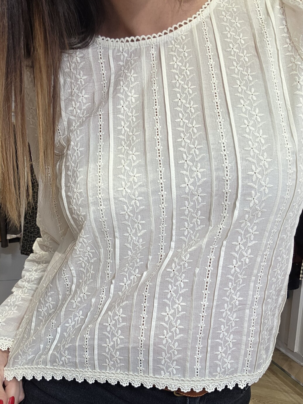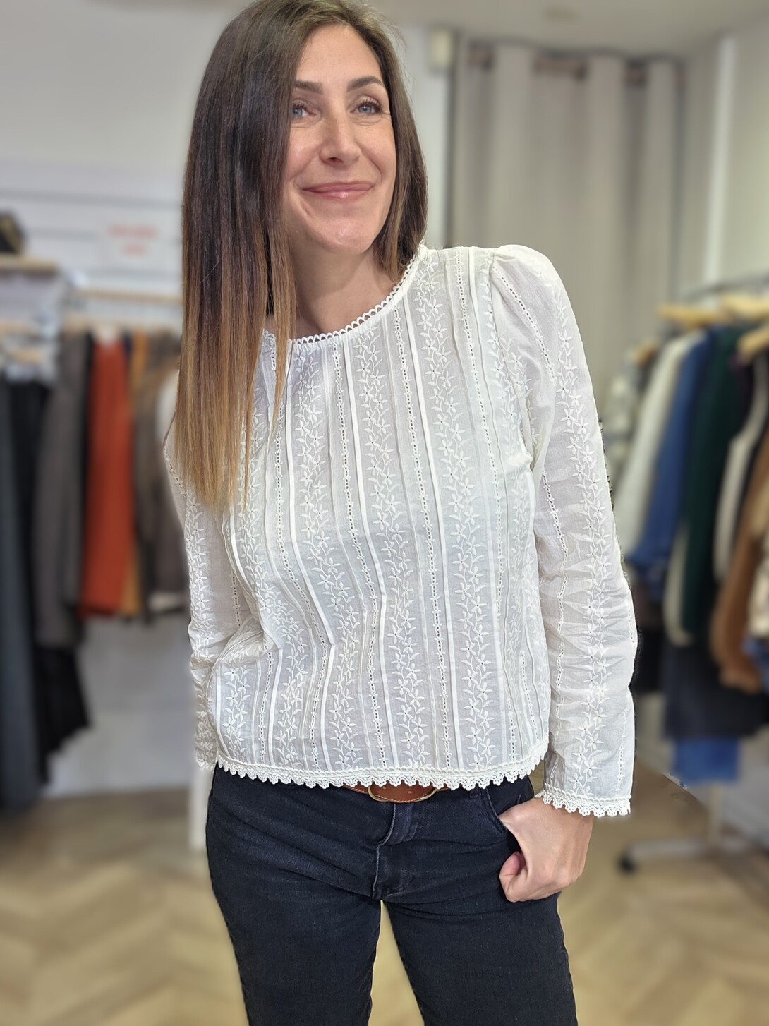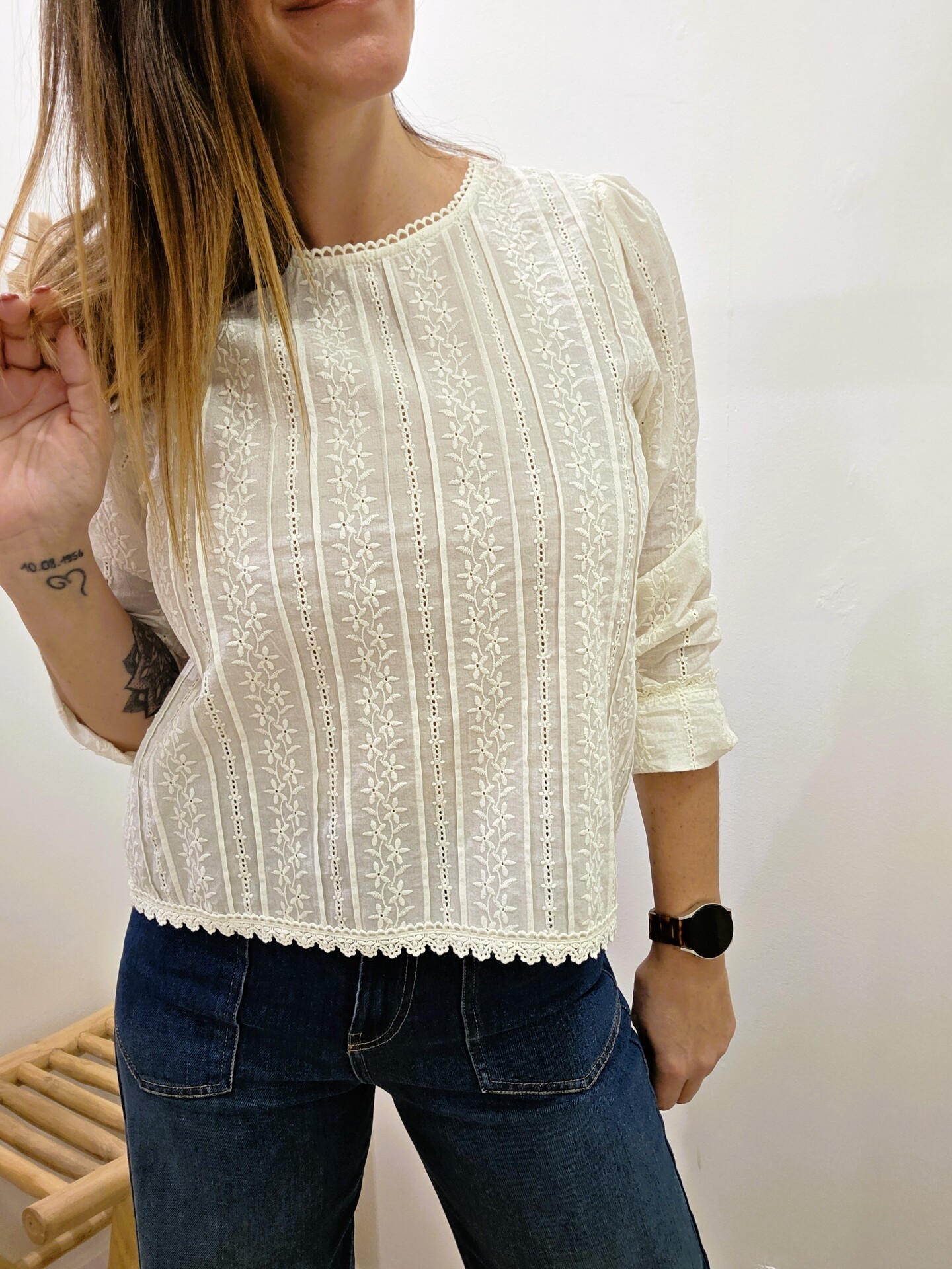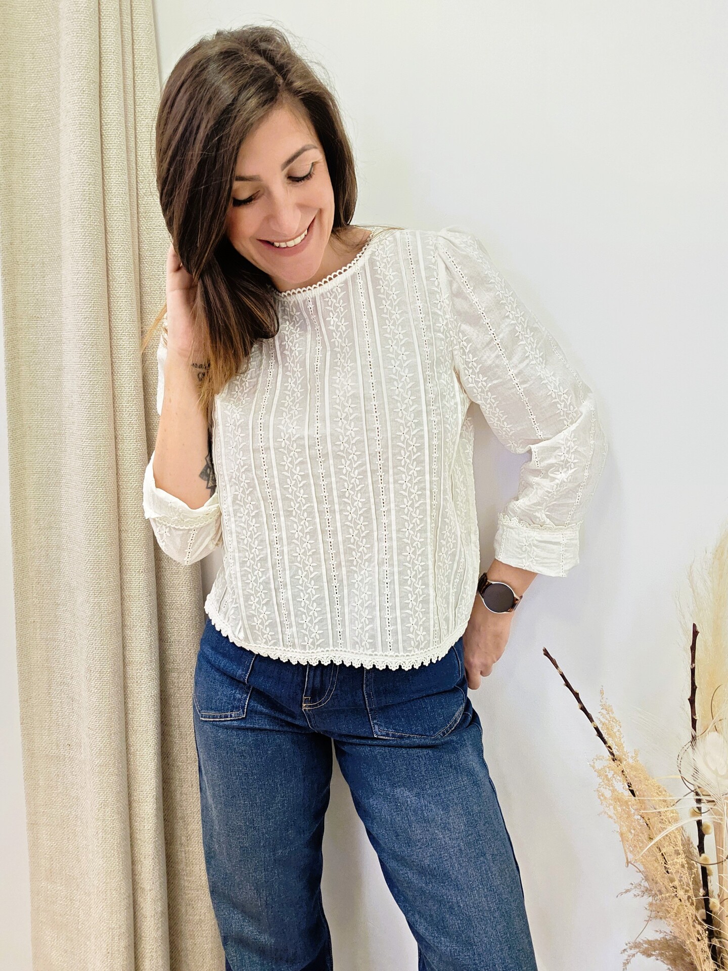 Son coton écru est joliment travaillé avec des broderies fleuries et de fines bandes ajourées, pour un rendu léger et féminin. L’encolure arrondie bordée d’une petite dentelle et le bas festonné ajoutent une finition soignée, tandis que les manches longues légèrement bouffantes donnent du charme sans en faire trop. Je porte ici la blouse Ambre avec un jean pour un look simple et élégant, facile à porter au quotidien.
