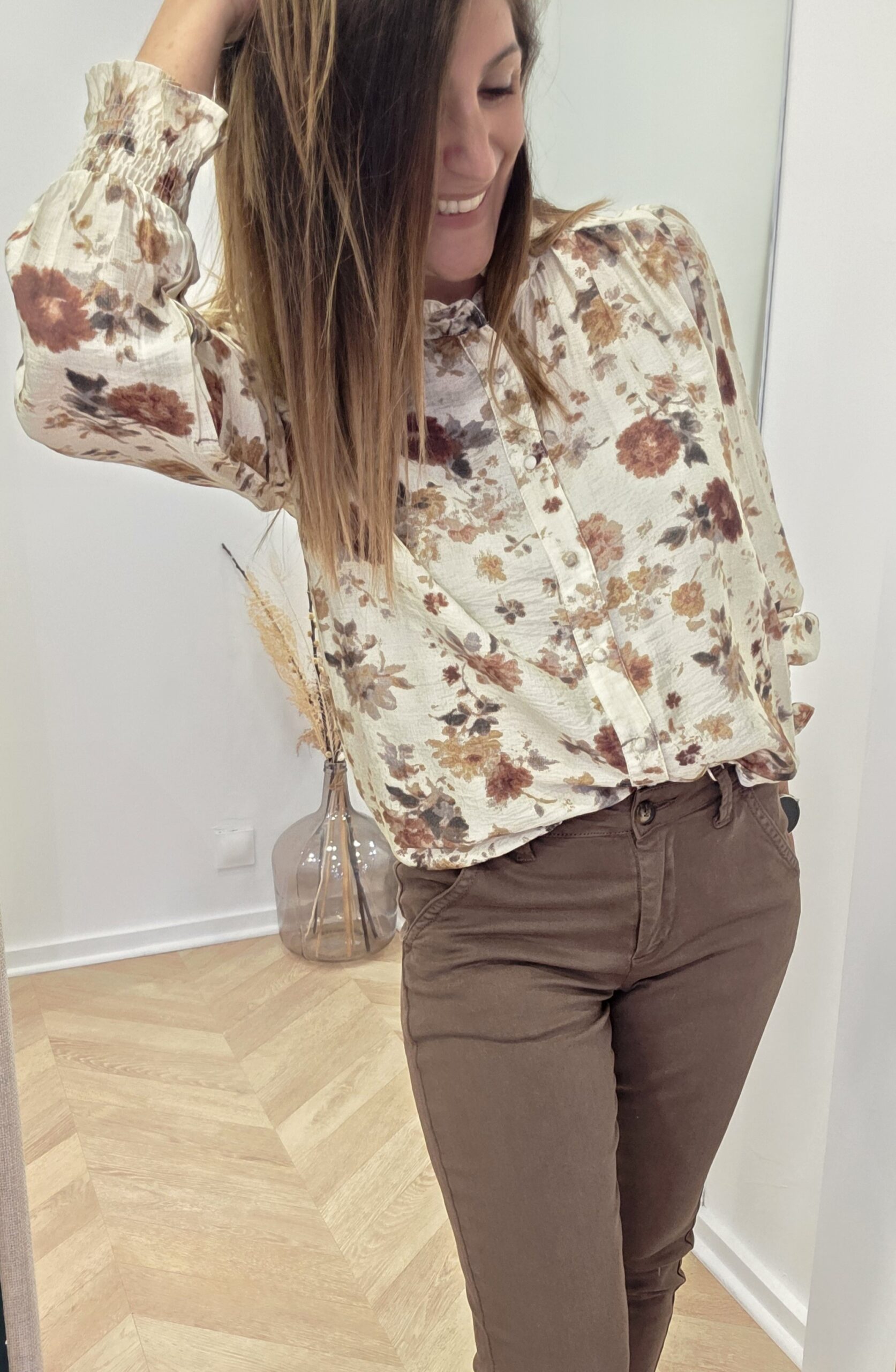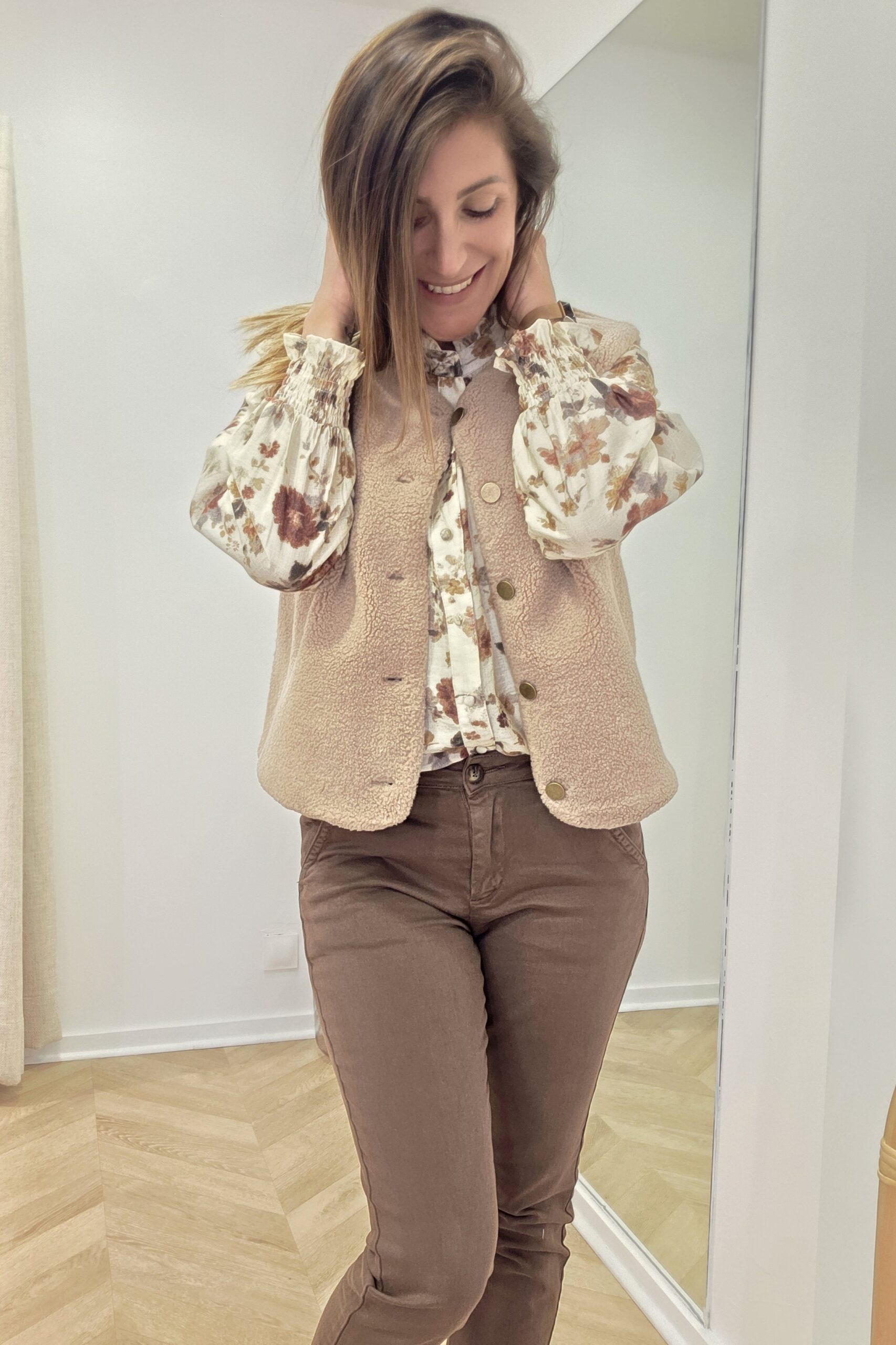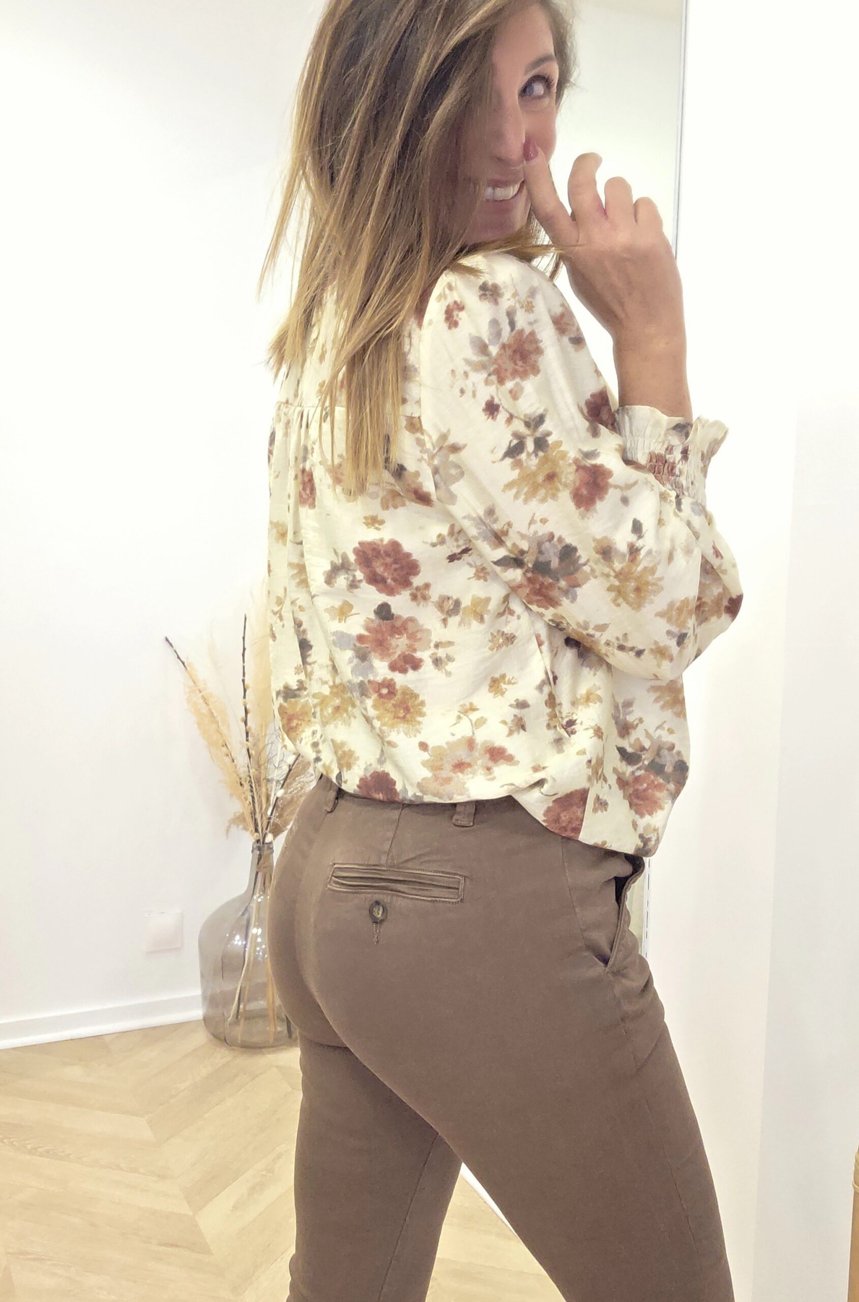 Sur les photos, je porte une taille S. La blouse Jeanne est ici associée au gilet Mout mout et au chino Milan coloris choco.