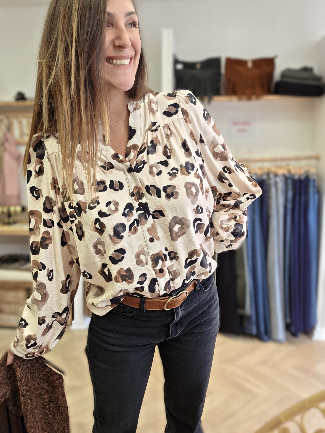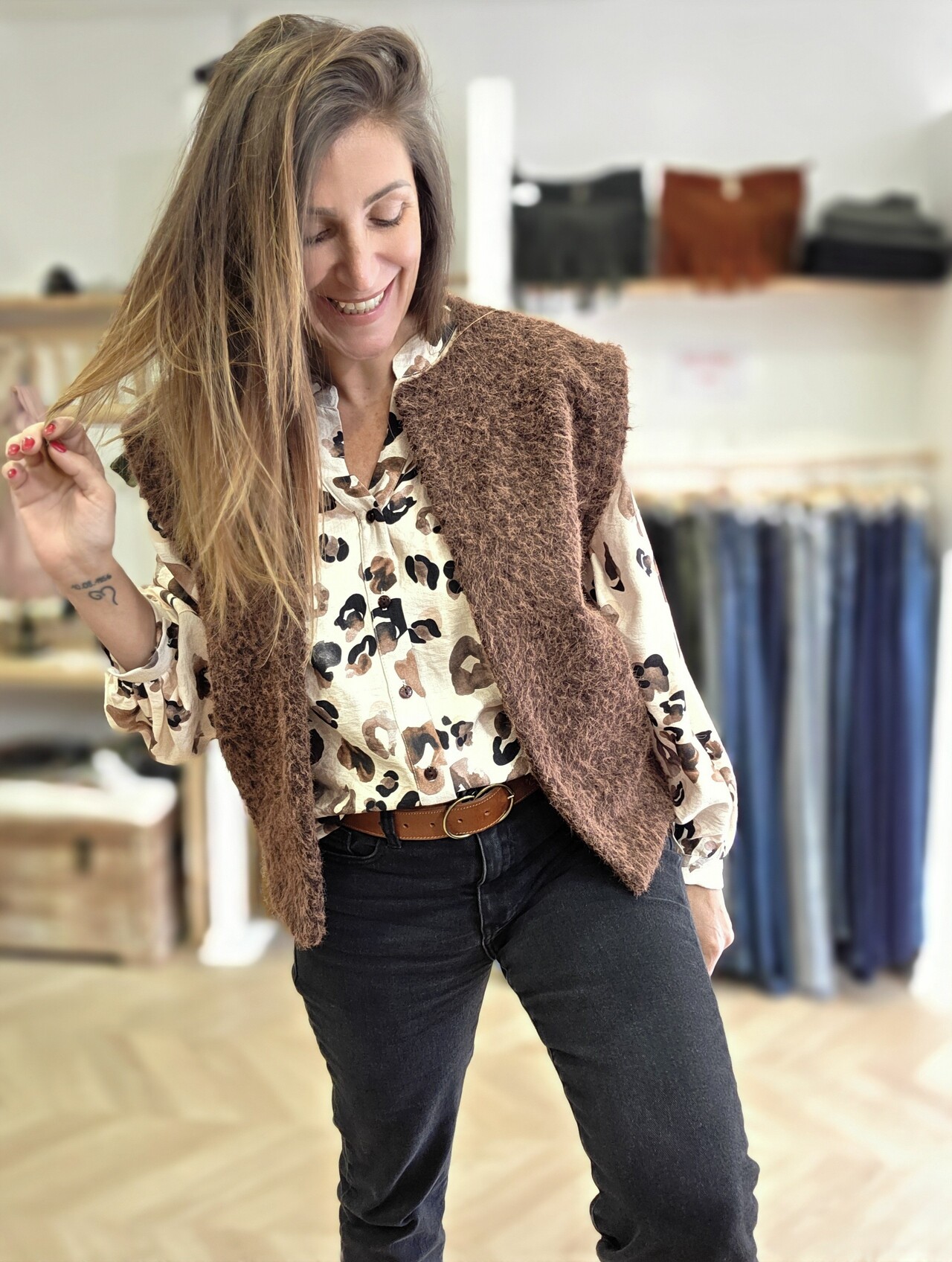 Confectionnée dans un tissu français, elle séduit par sa matière légère et agréable à porter. Sa coupe souple tombe naturellement, sans marquer, pour un rendu féminin et facile à vivre. Je la porte ici avec le jean Martin pour une silhouette simple et soignée, et je l’ai associée au petit gilet Maud pour un look chaleureux et de saison.