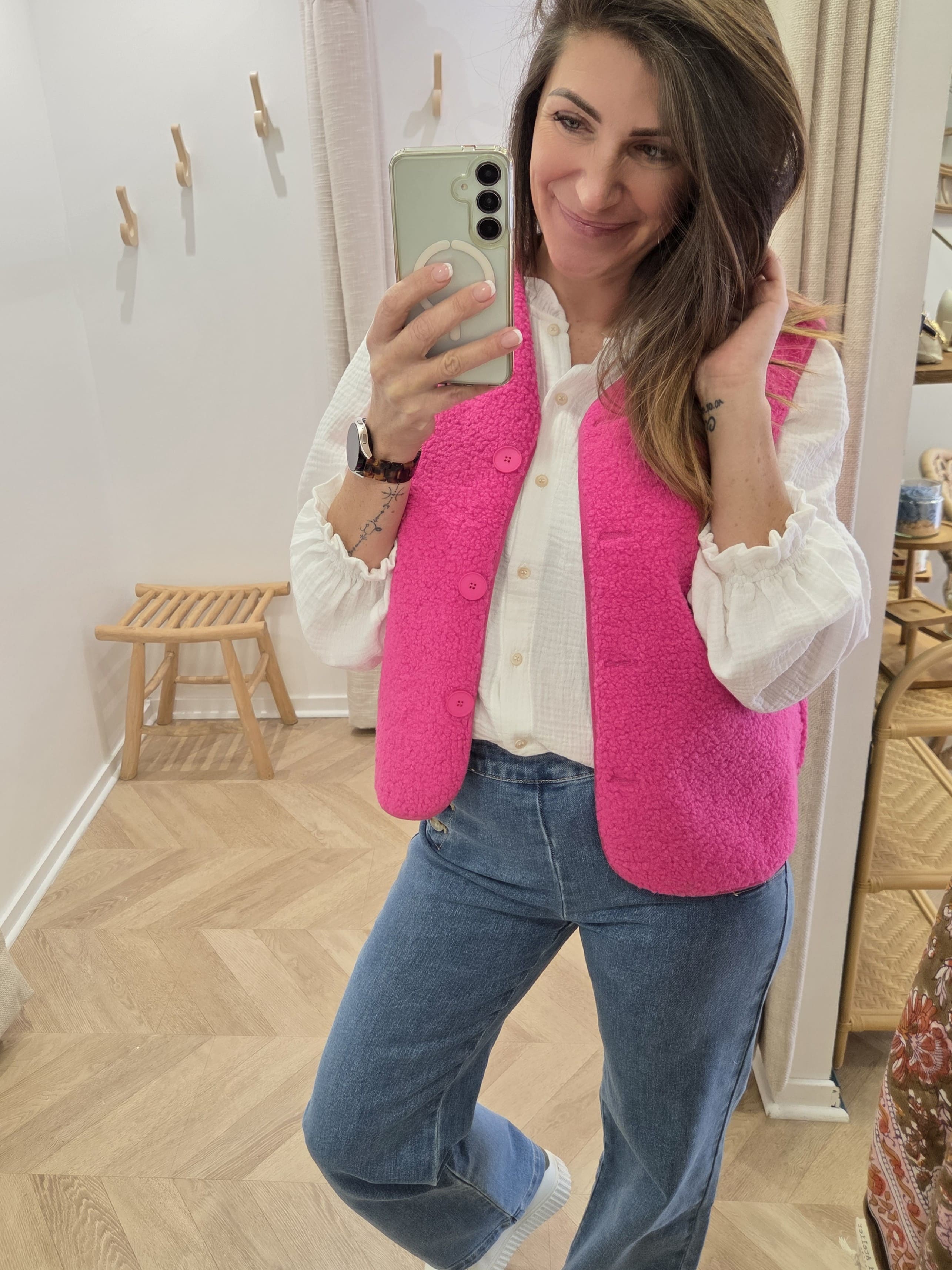 Les poignets élastiqués permettent de retrousser les manches facilement et apportent un joli volume aux manches. Portée seule avec un jean taille haute ou associée au gilet Anis et au jean Carter comme sur les photos, elle compose un look féminin, lumineux et facile à porter au quotidien. Je porte une taille XS sur les photos.