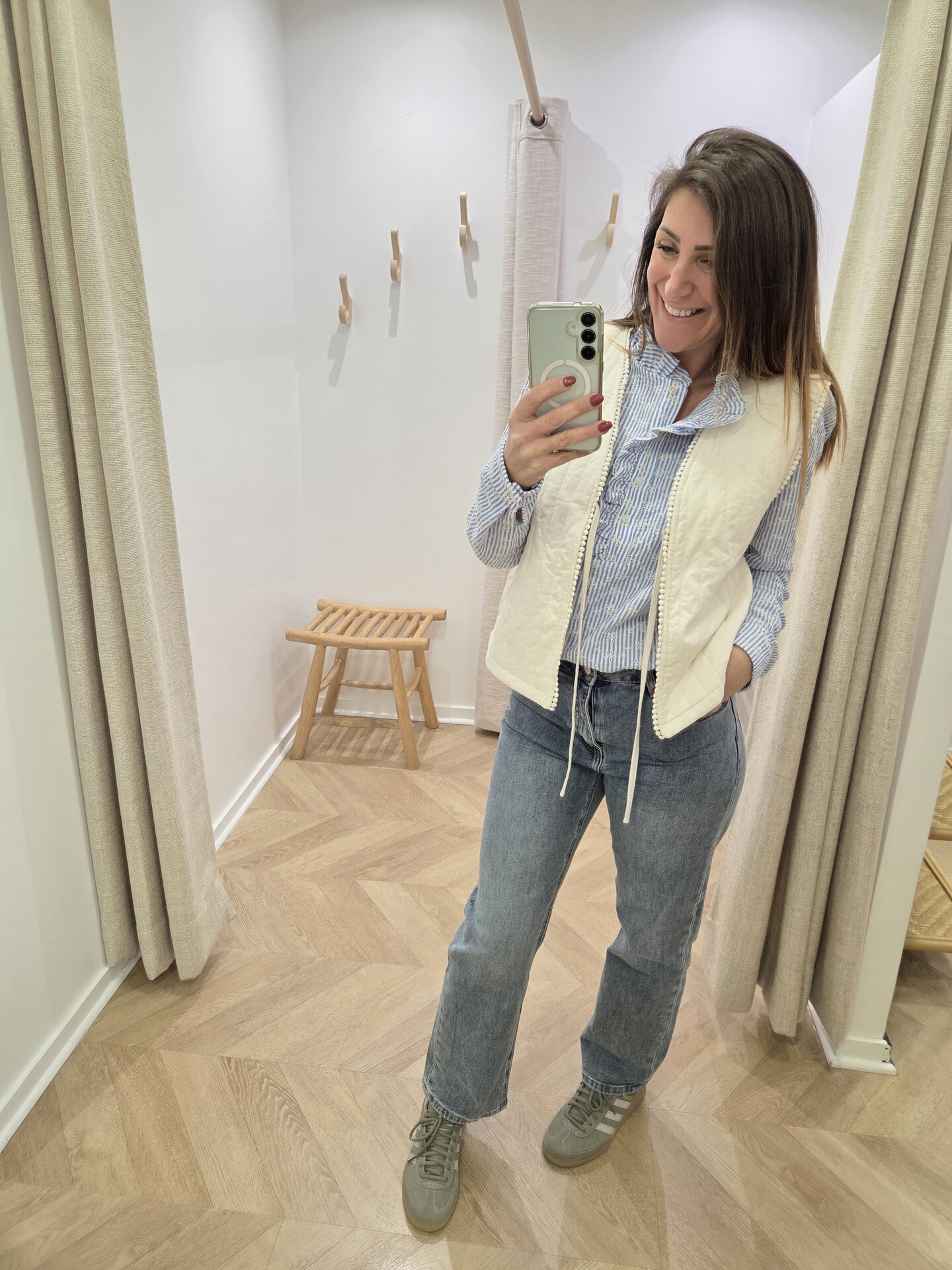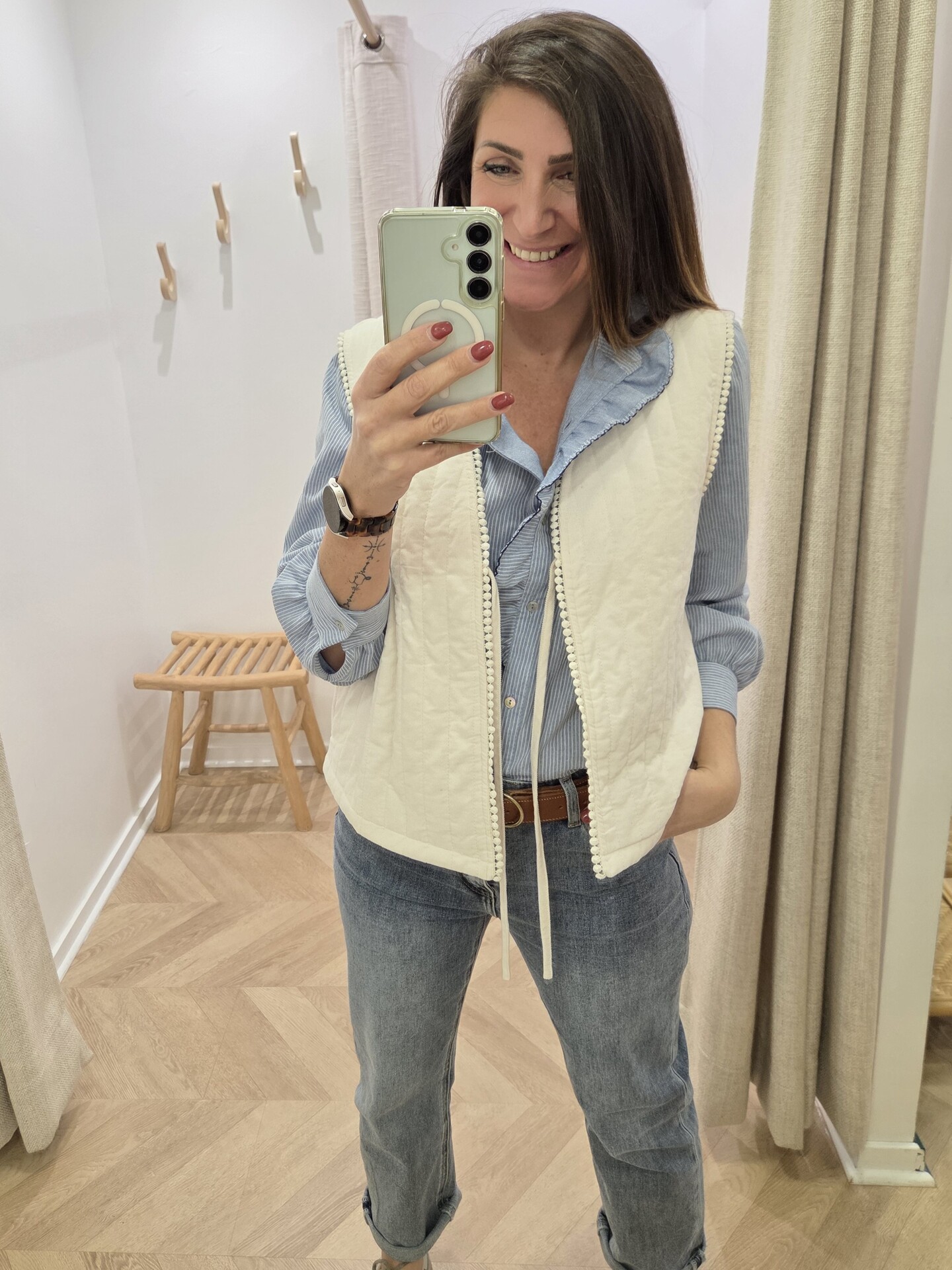 Facile à associer, la chemise Janique se porte aussi bien rentrée dans un jean que légèrement blousée pour un rendu plus décontracté. Sur les photos, elle est portée avec le jean Solange, une association simple et efficace pour un look du quotidien. Elle s’accorde également très bien avec le gilet Gabriella, pour une tenue plus douce et enveloppante, idéale pour les journées plus fraîches.