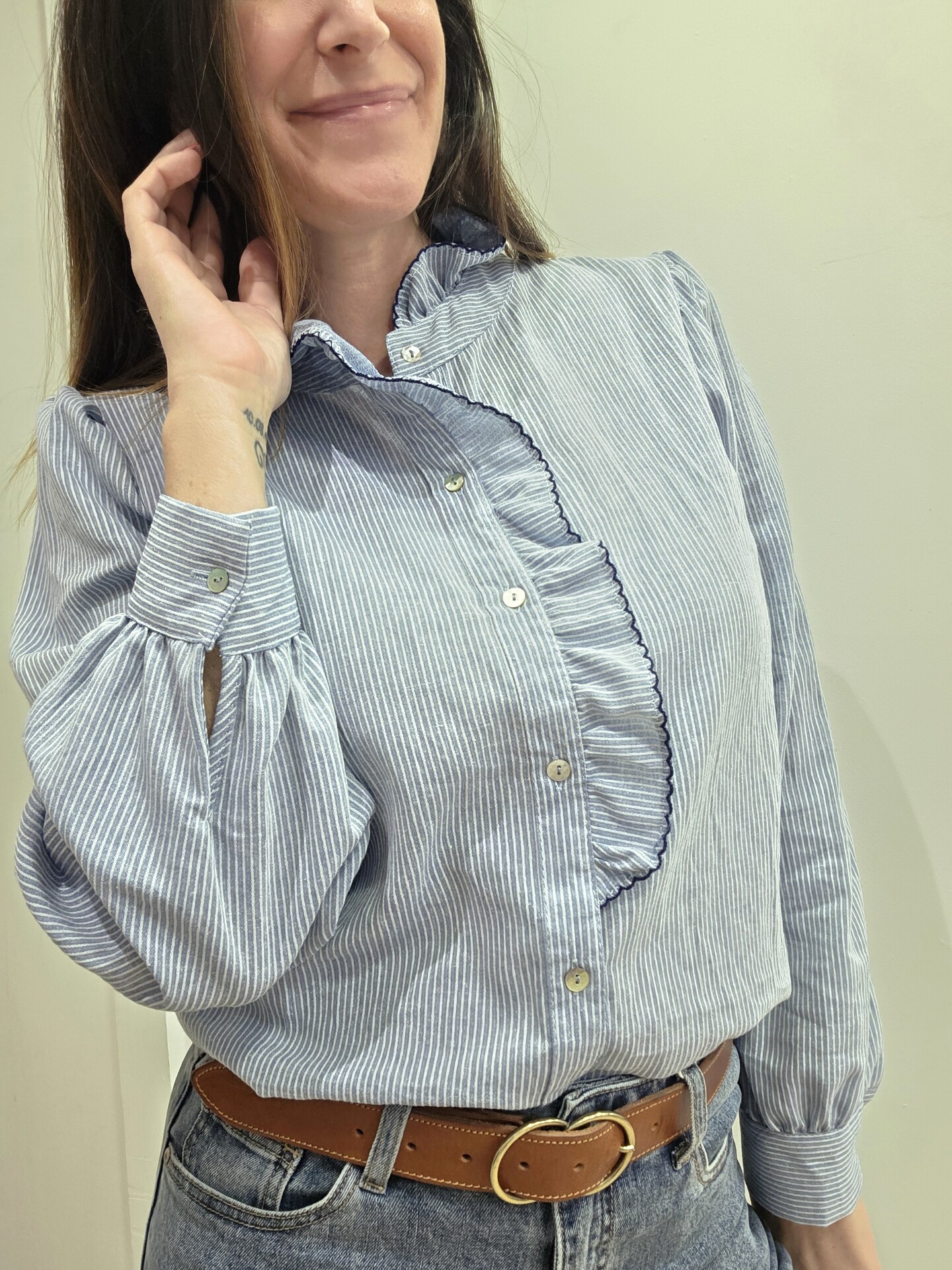 On aime la matière de la chemise Janique, agréable et naturelle, qui offre un joli tombé et beaucoup de confort. Son mélange de coton, viscose et lin apporte de la douceur, tout en restant respirant, idéal pour la mi-saison comme pour les journées plus douces. Les rayures fines, associées aux volants délicats le long de la boutonnière et du col, donnent à la chemise Janique un charme féminin et intemporel.