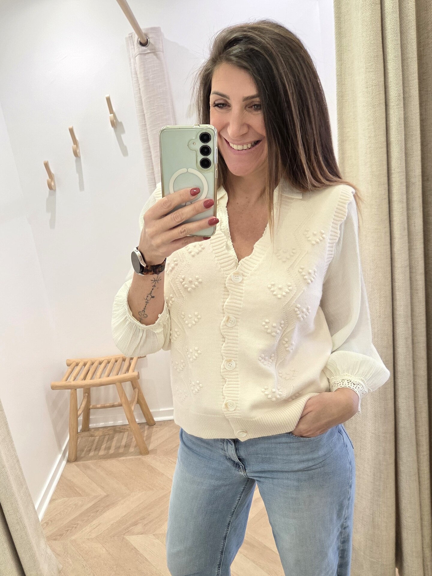 Confectionné dans une maille écrue délicatement texturée, ce gilet se distingue par ses jolis motifs en relief et ses boutons ton sur ton sur le devant. L’encolure subtilement travaillée apporte une touche raffinée, facile à associer aussi bien avec une blouse qu’avec une chemise.