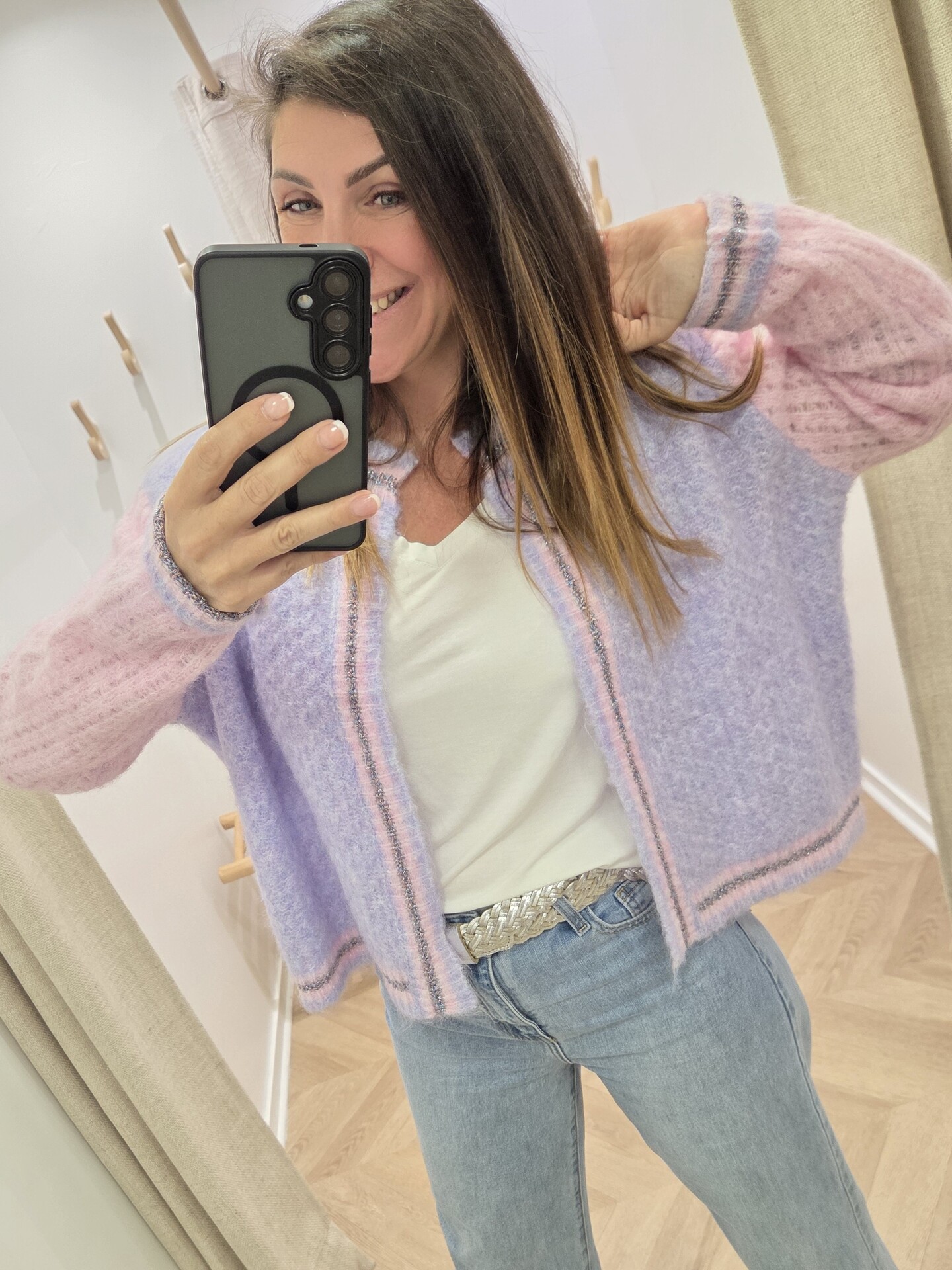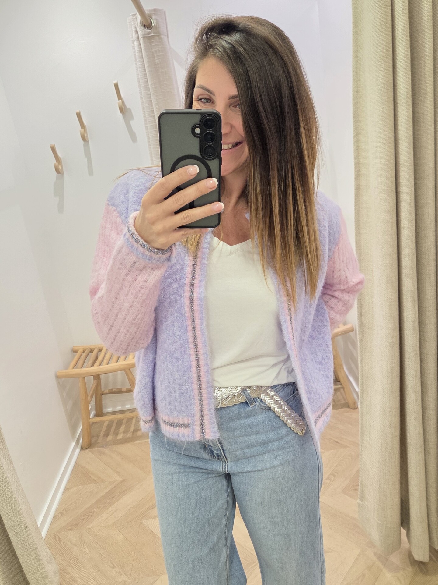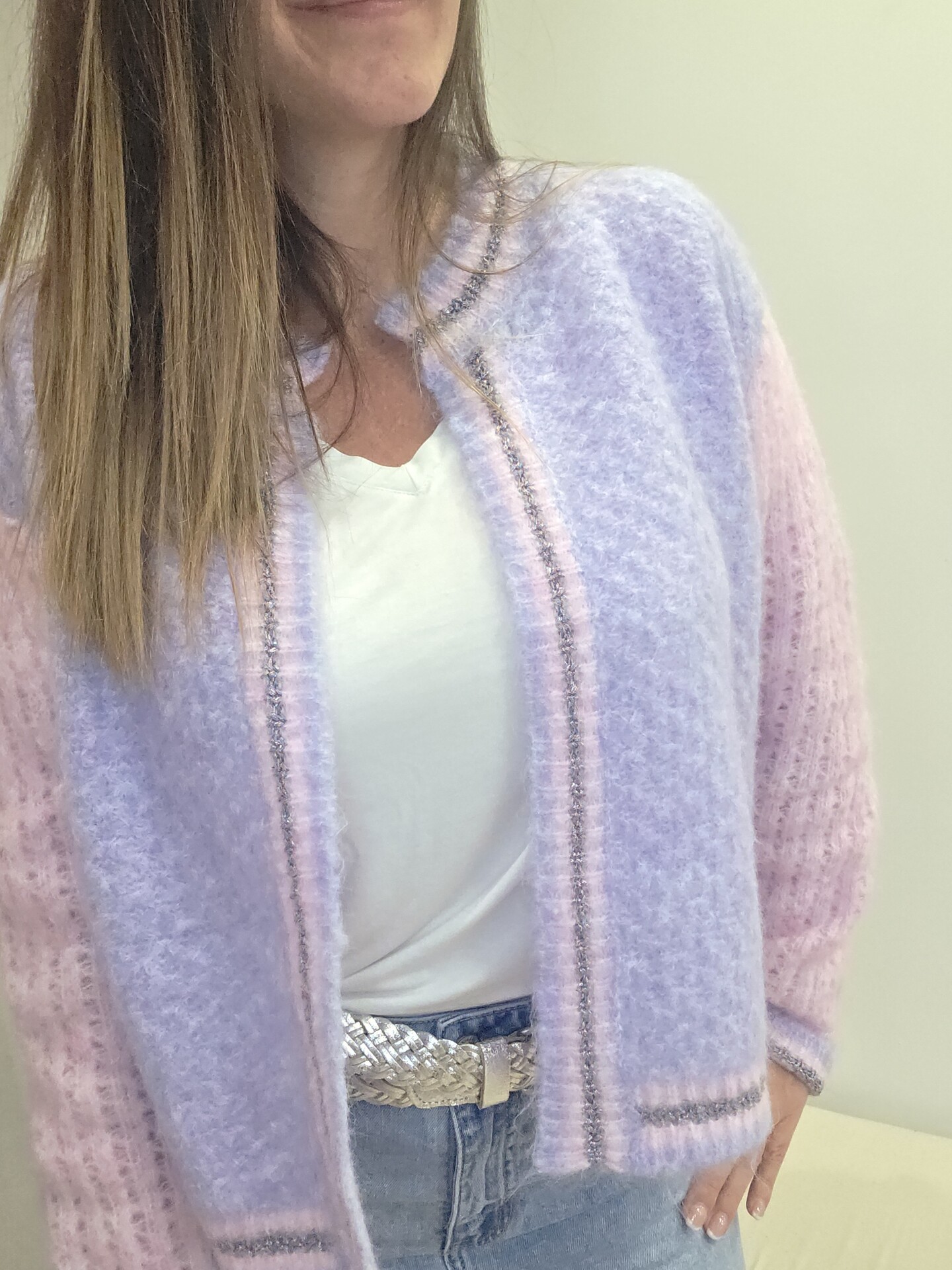 Le gilet Malabar lilas et rose tout doux est une vraie petite merveille à enfiler pour apporter de la douceur et de la lumière à une tenue.