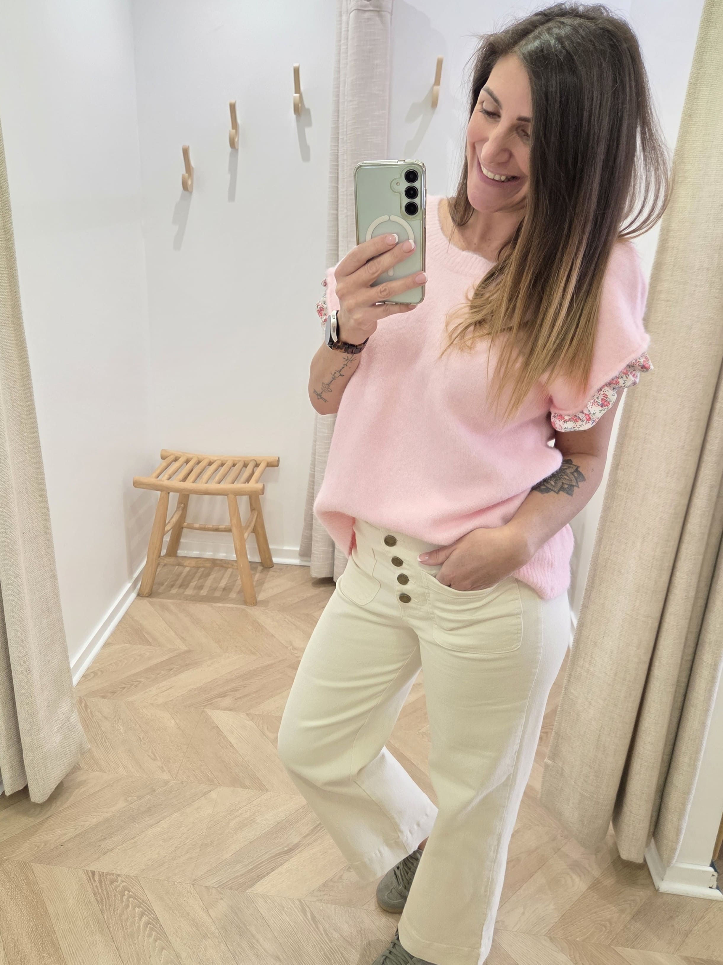 Sur les photos, je porte le gilet réversible Vénus rose pâle avec le pantalon Waldo, pour un look doux, lumineux et très facile à porter au quotidien. Je porte une taille S/M.