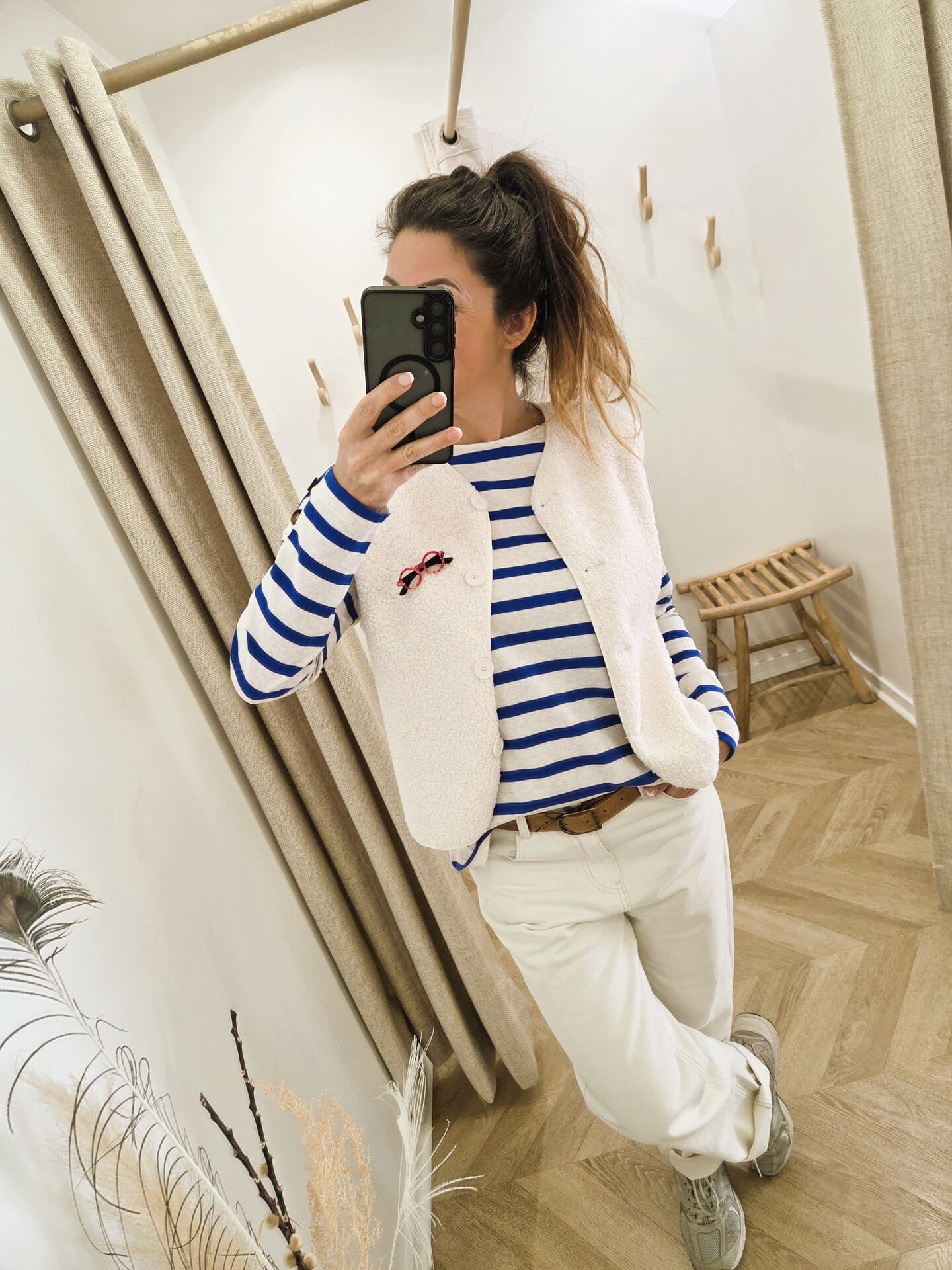 Je la porte ici avec le gilet Anis et le pantalon Jenson pour un look confortable et lumineux.