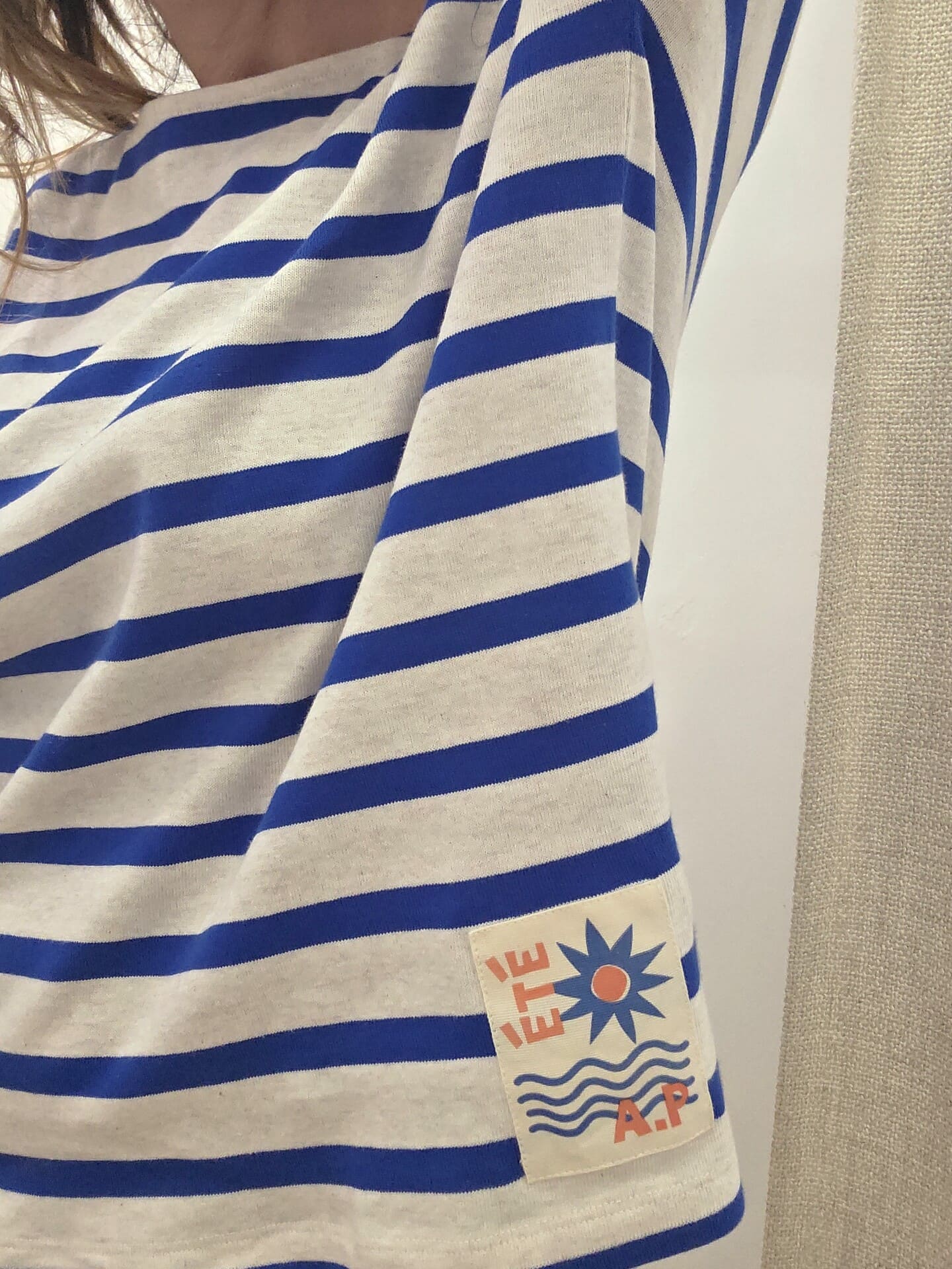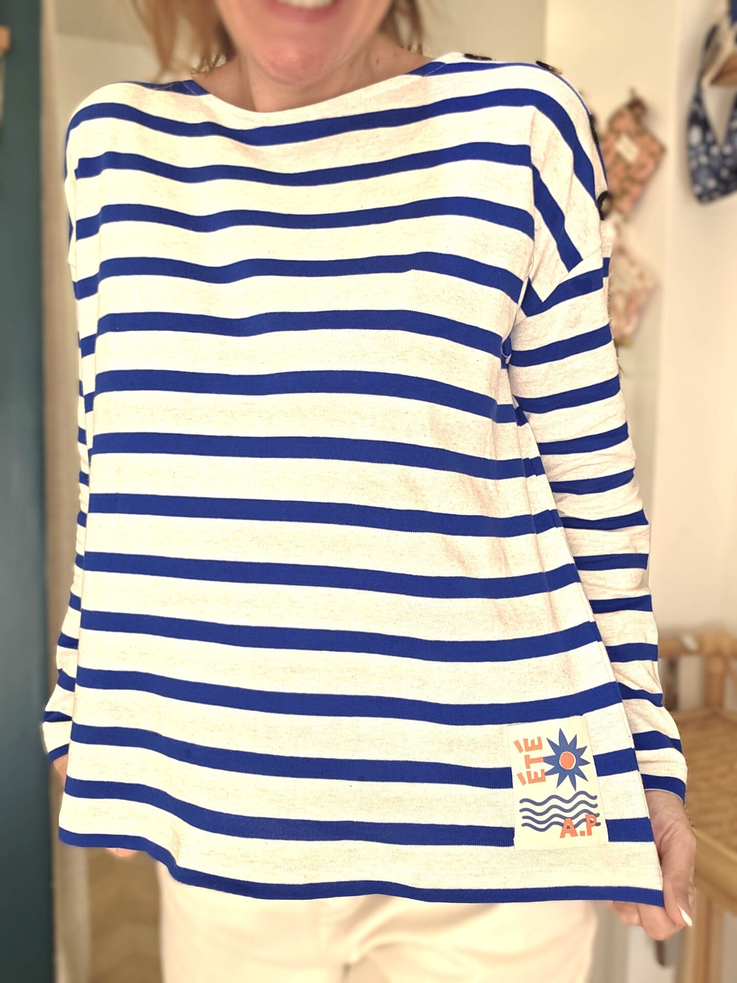 On aime particulièrement ses rayures bleu intense sur fond écru, qui lui donnent un style intemporel, ainsi que ses jolis boutons sur l’épaule, détail signature qui apporte du charme à la pièce.
