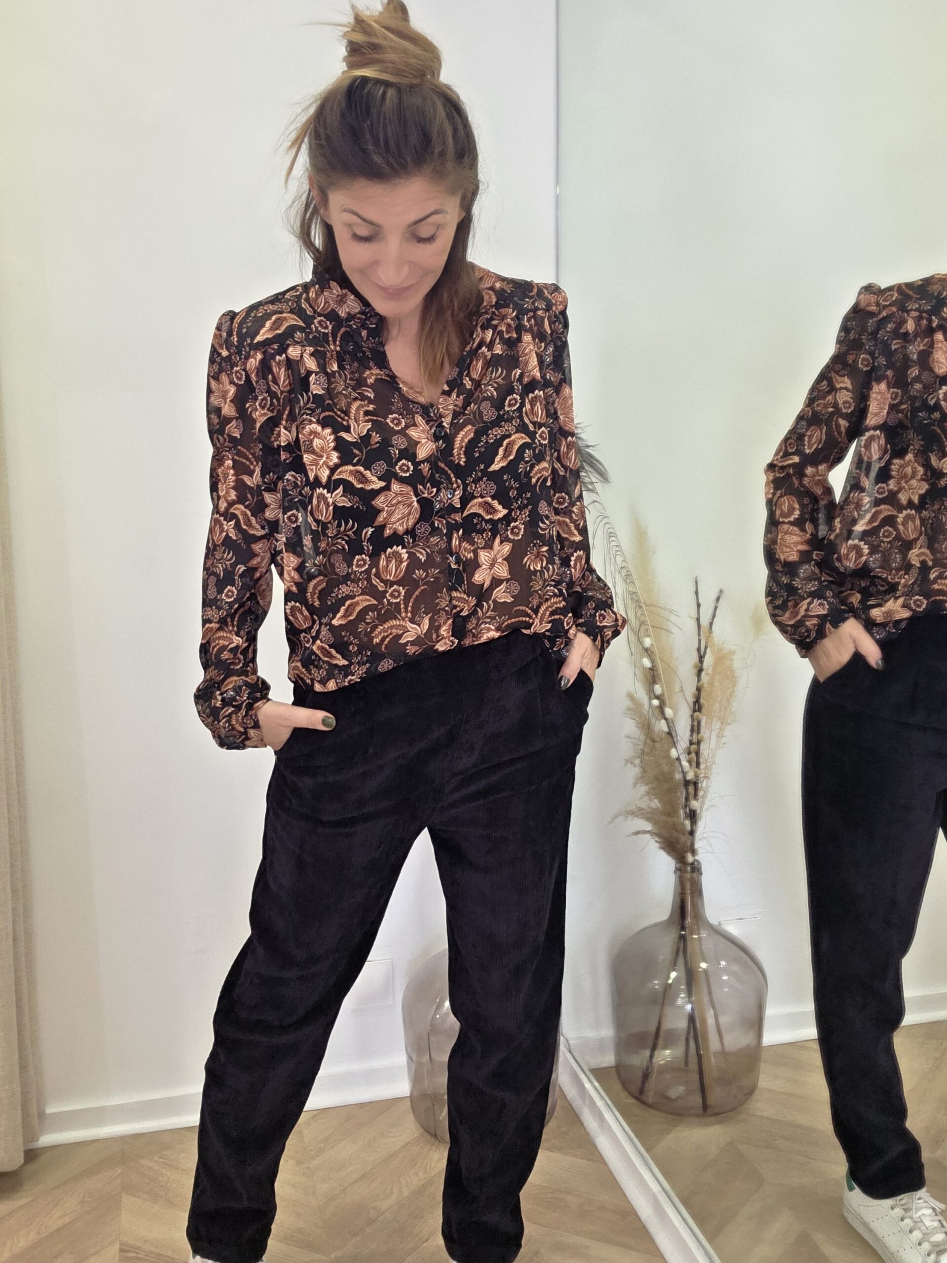En coloris noir, il se porte aussi bien en version chic avec la blouse Fiona noire fleurie, qu’en version plus décontractée avec un pull en maille douce ou une veste structurée. Sur les photos, je porte une taille S.
