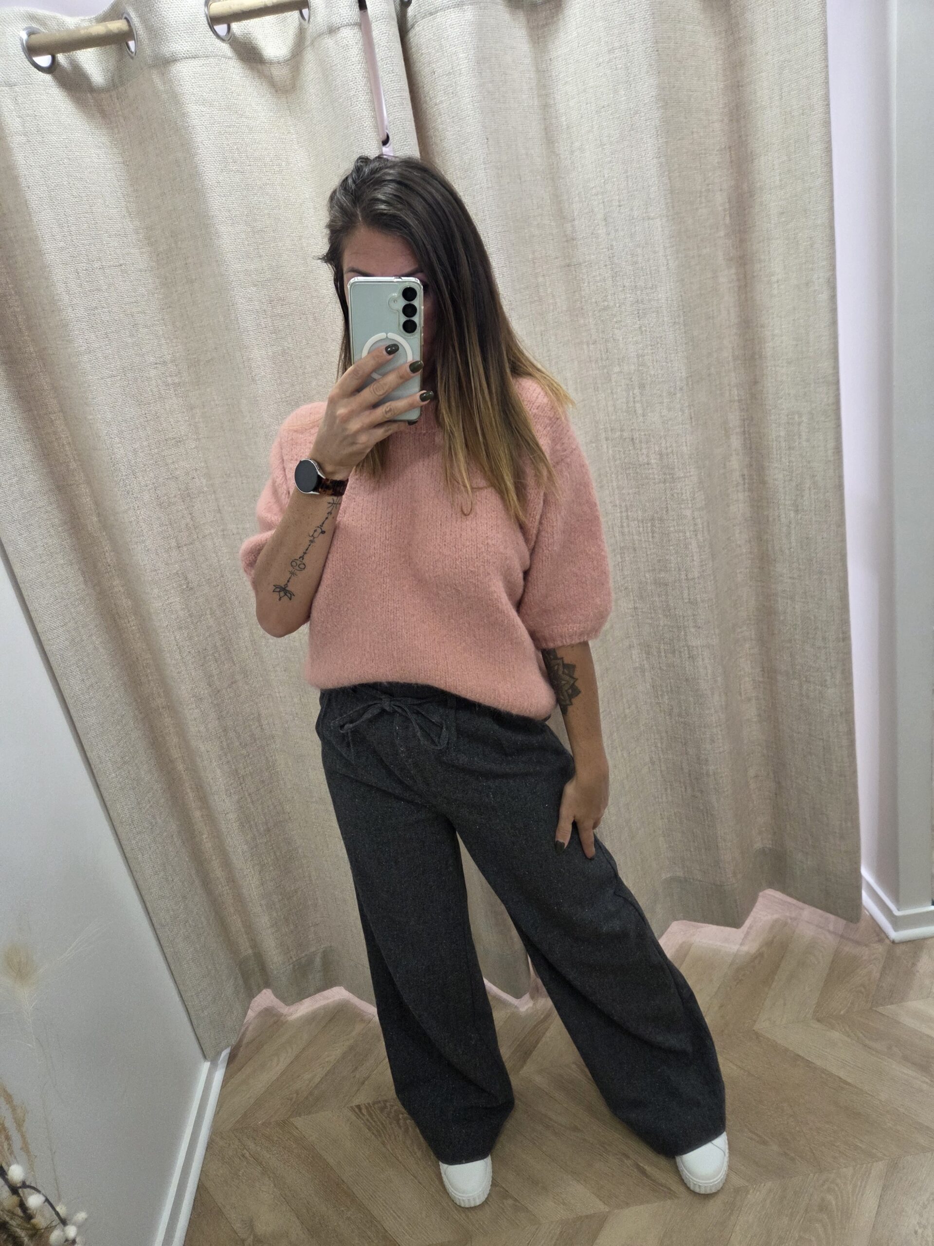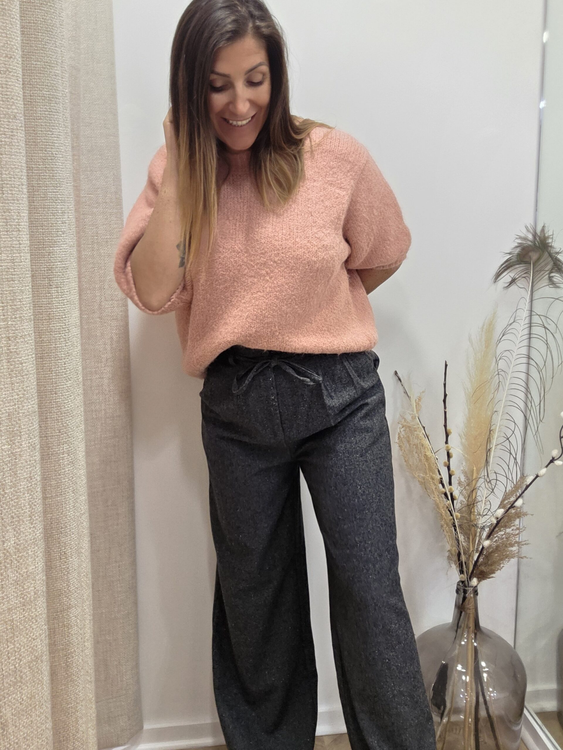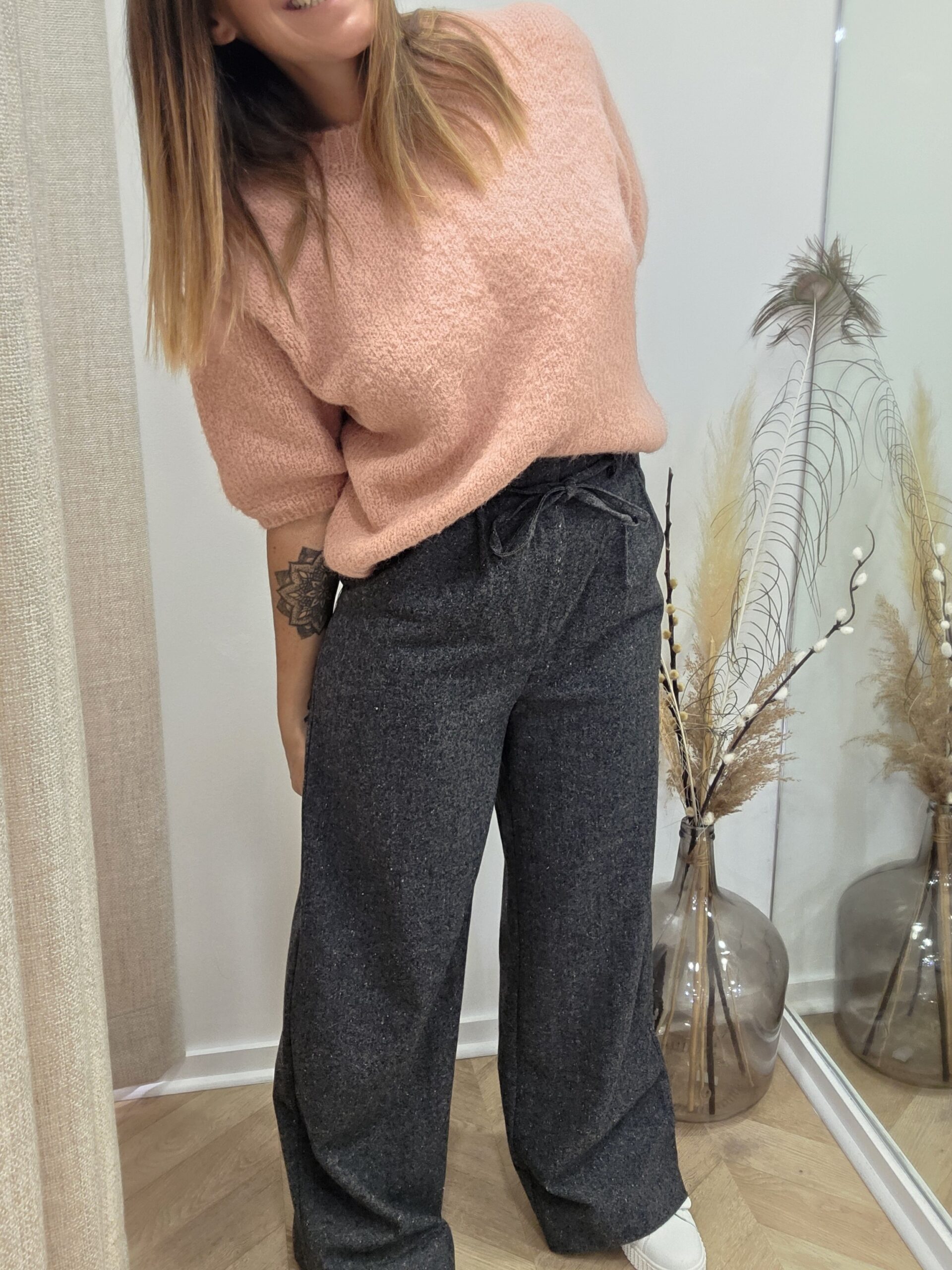 Avec sa taille ajustée et son lien à nouer, il s’adapte à toutes les morphologies. Sa matière douce et légèrement chinée lui donne un petit côté raffiné qu’on adore. Ici, je le porte avec le pull manches courtes Lycie en rose pour un look doux et lumineux, parfait en toute saison.