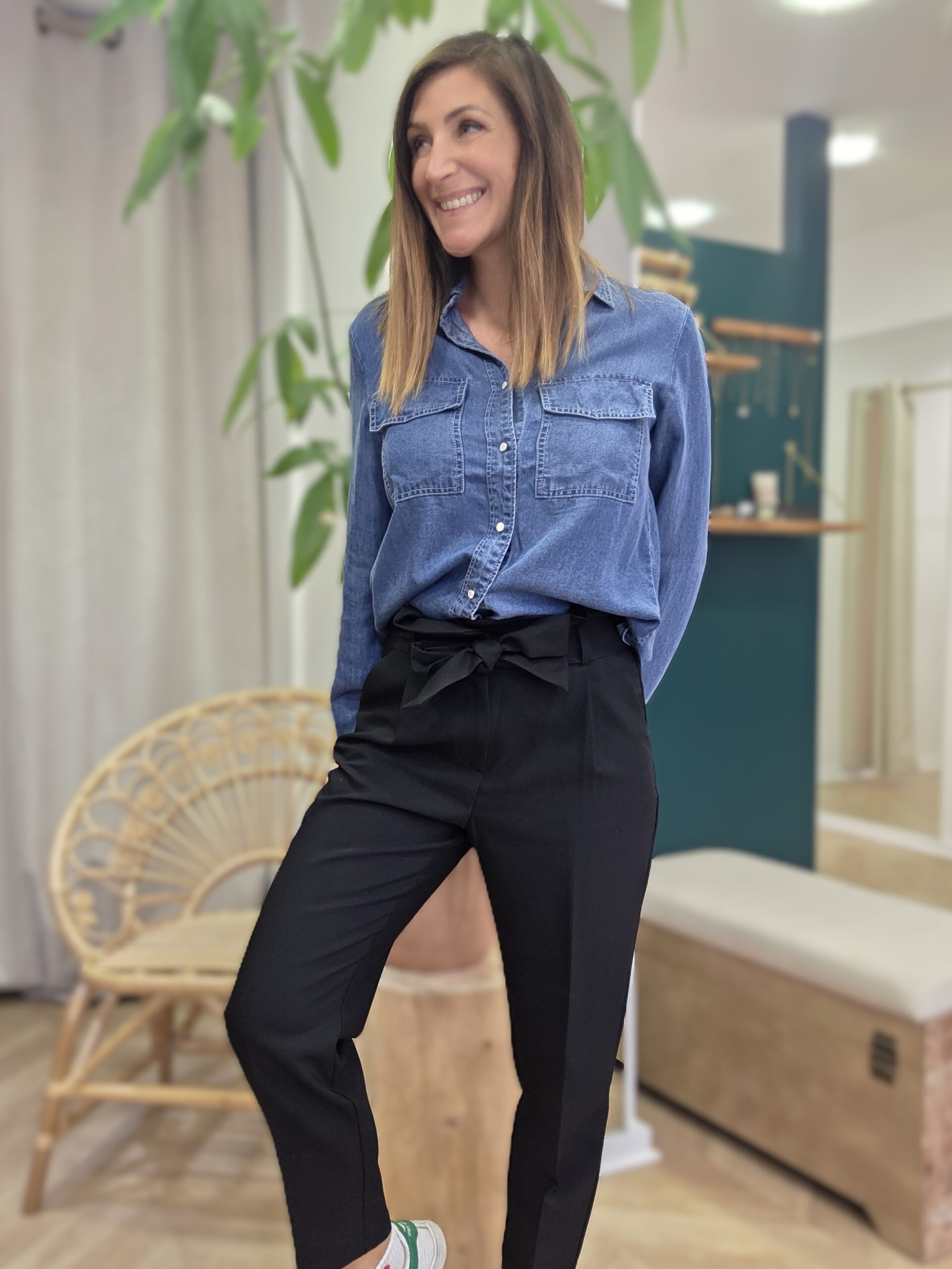 Le pantalon Thalia séduit par sa coupe fluide et féminine, parfaite pour allonger la silhouette. Il est muni d’un bouton discret, de deux poches pratiques et d’une ceinture à nouer à la taille (amovible), qui apporte une jolie finition raffinée. Son tissu doux et agréable offre confort et style, que ce soit pour une journée de travail ou une sortie habillée.