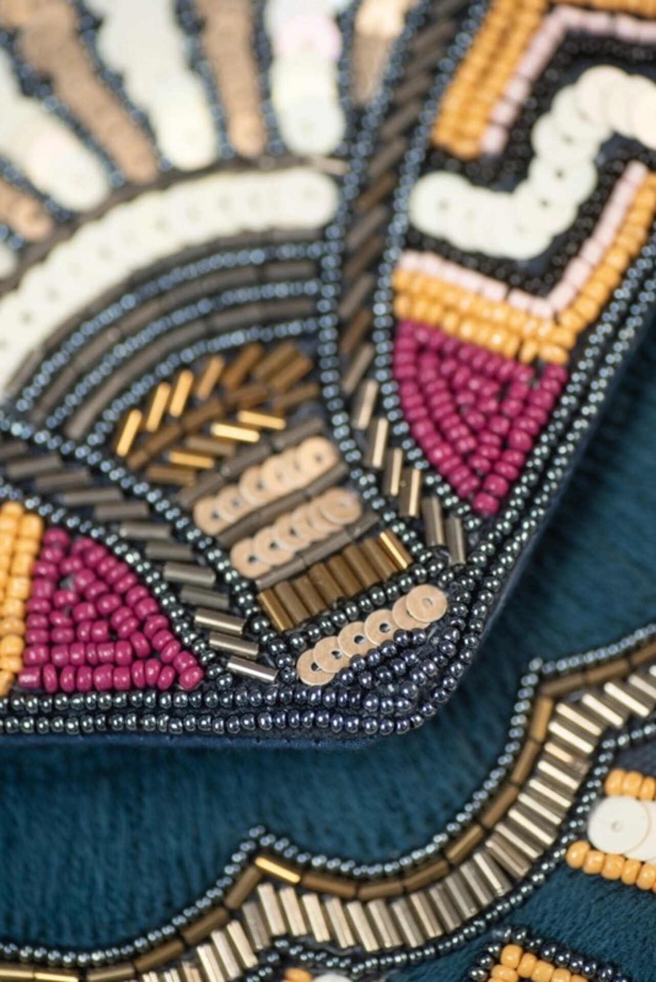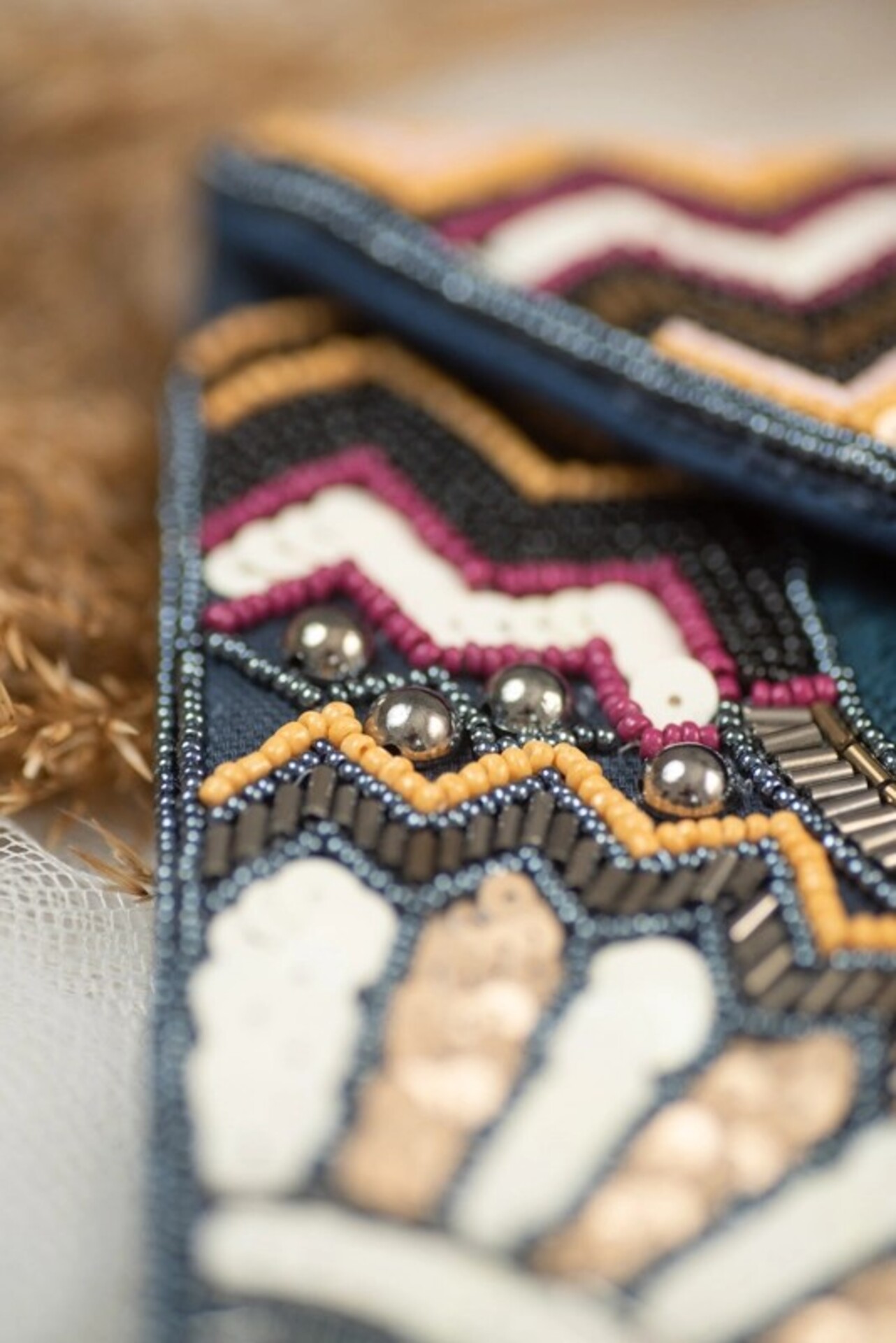 Entièrement réalisée à la main, cette pochette met en valeur un travail minutieux de perles qui crée du relief et attire le regard. Chaque modèle possède son propre motif et ses nuances, ce qui rend chaque pièce unique et pleine de charme.