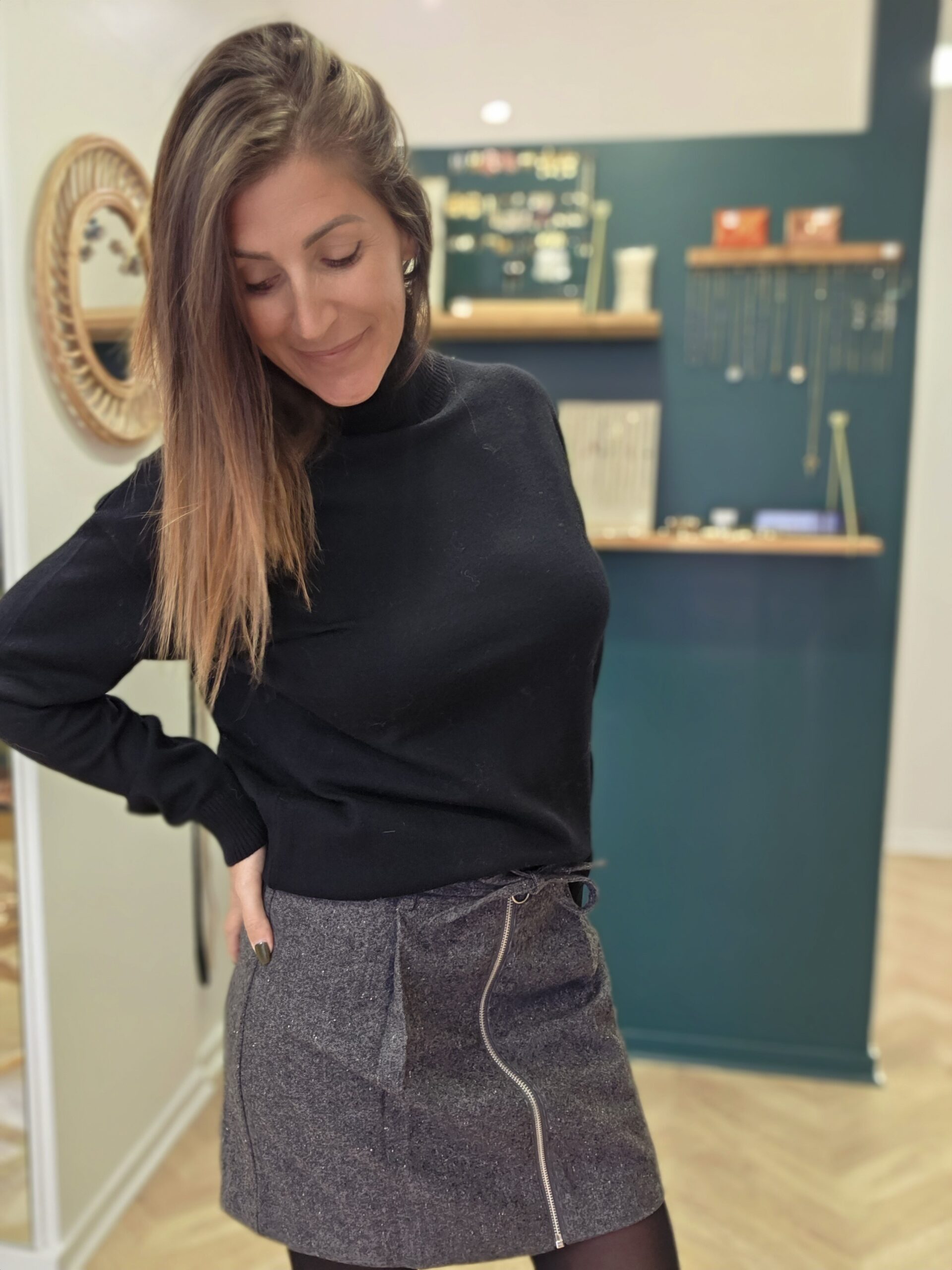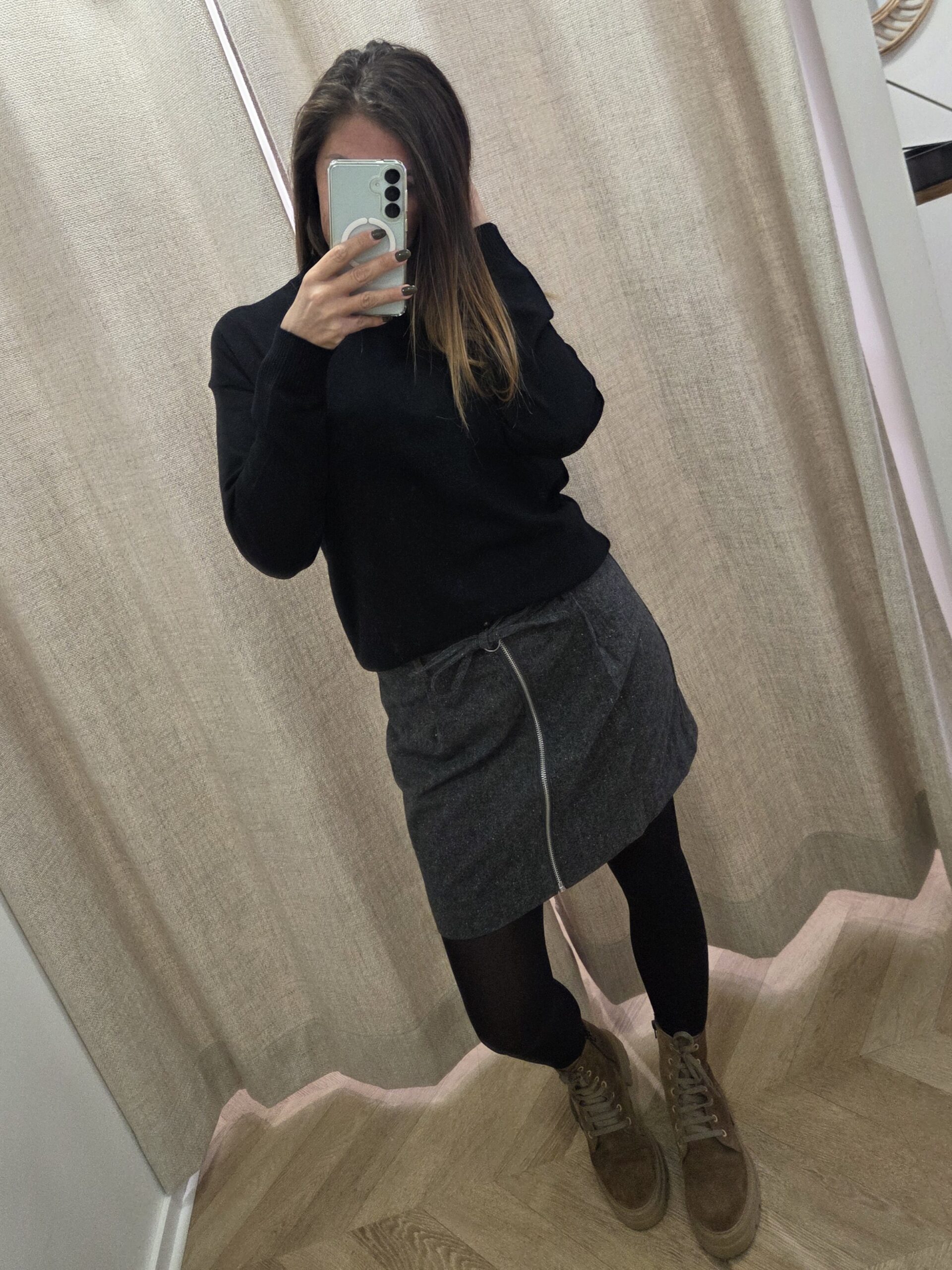 Avec sa coupe droite et ses finitions soignées, il s’associe facilement à tous les styles. Ici, je le porte avec la jupe Gemma, un combo que j’adore pour son côté féminin et raffiné.