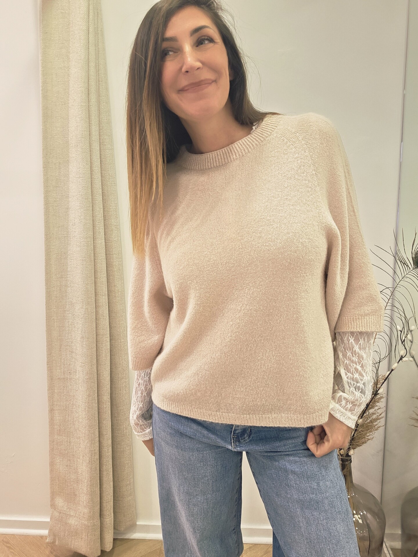 Sa maille douce enrichie en alpaga apporte une sensation agréable sur la peau. Sa coupe souple et sa taille unique très bien taillée s’adaptent facilement à différentes morphologies. Je le porte ici avec le sous-pull Sami en dentelle et le jean Sharon pour un look féminin et facile à vivre.