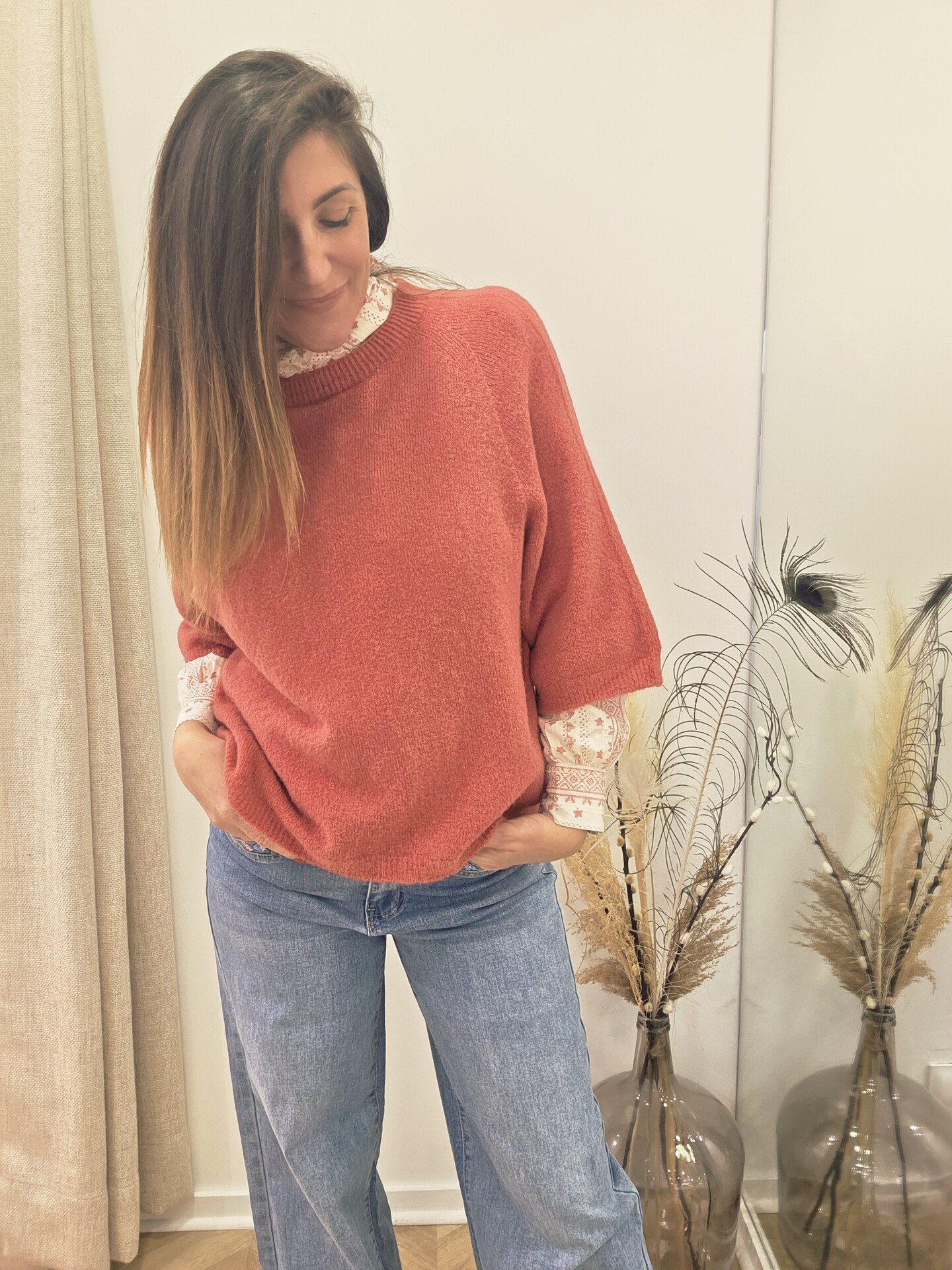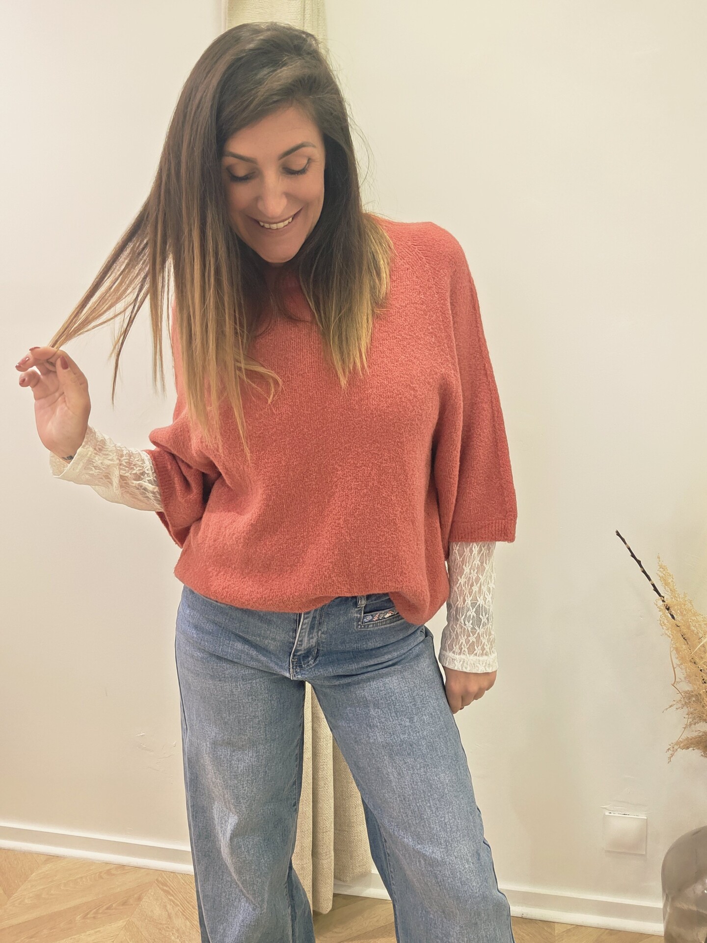 Sa maille douce enrichie en alpaga apporte une sensation agréable sur la peau. Sa coupe souple et sa taille unique très bien taillée s’adaptent facilement à différentes morphologies. Je le porte ici avec le sous-pull Sami en dentelle et le jean Sharon pour un look féminin et facile à vivre.