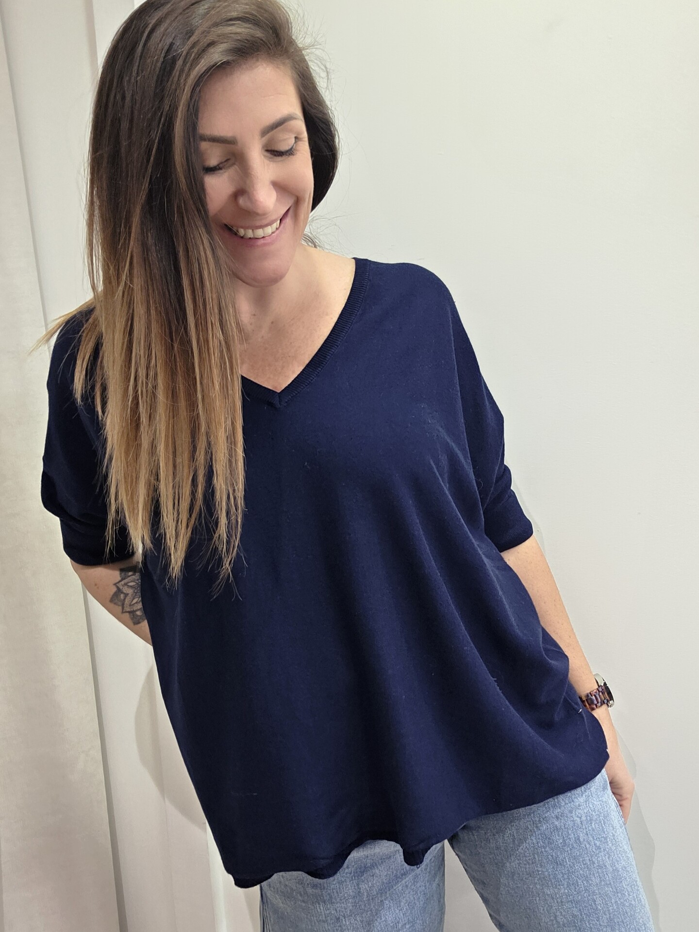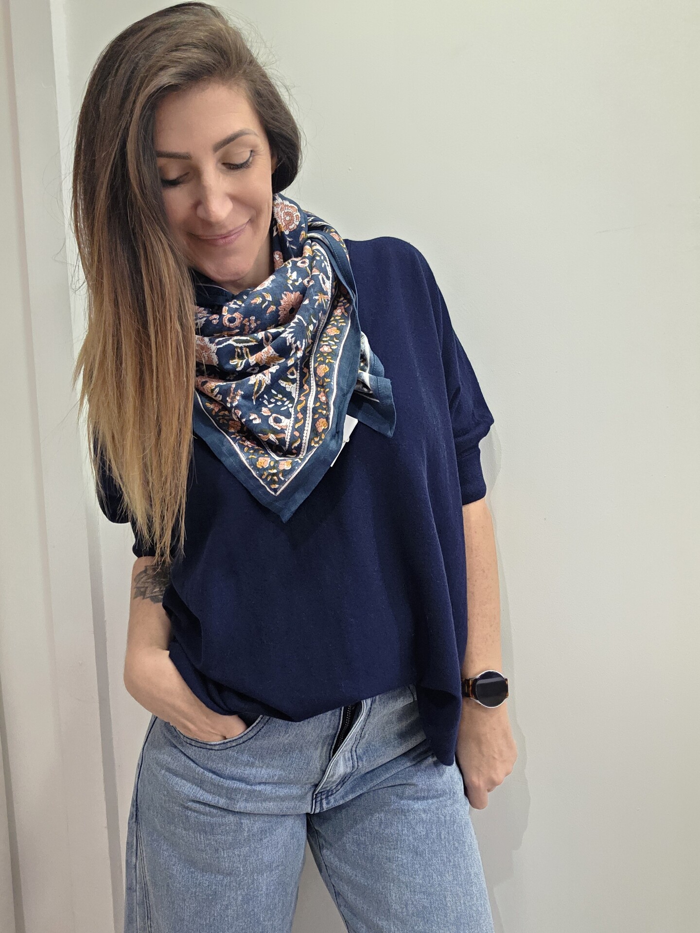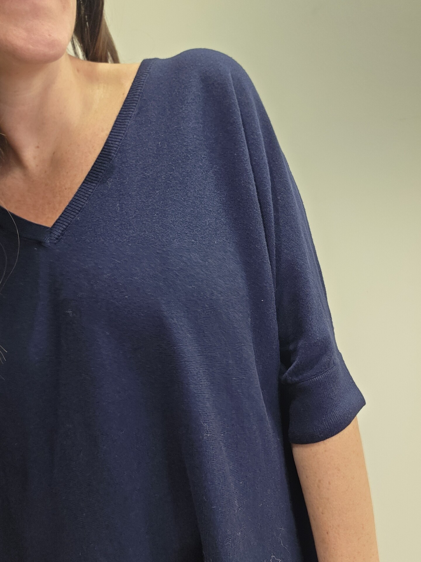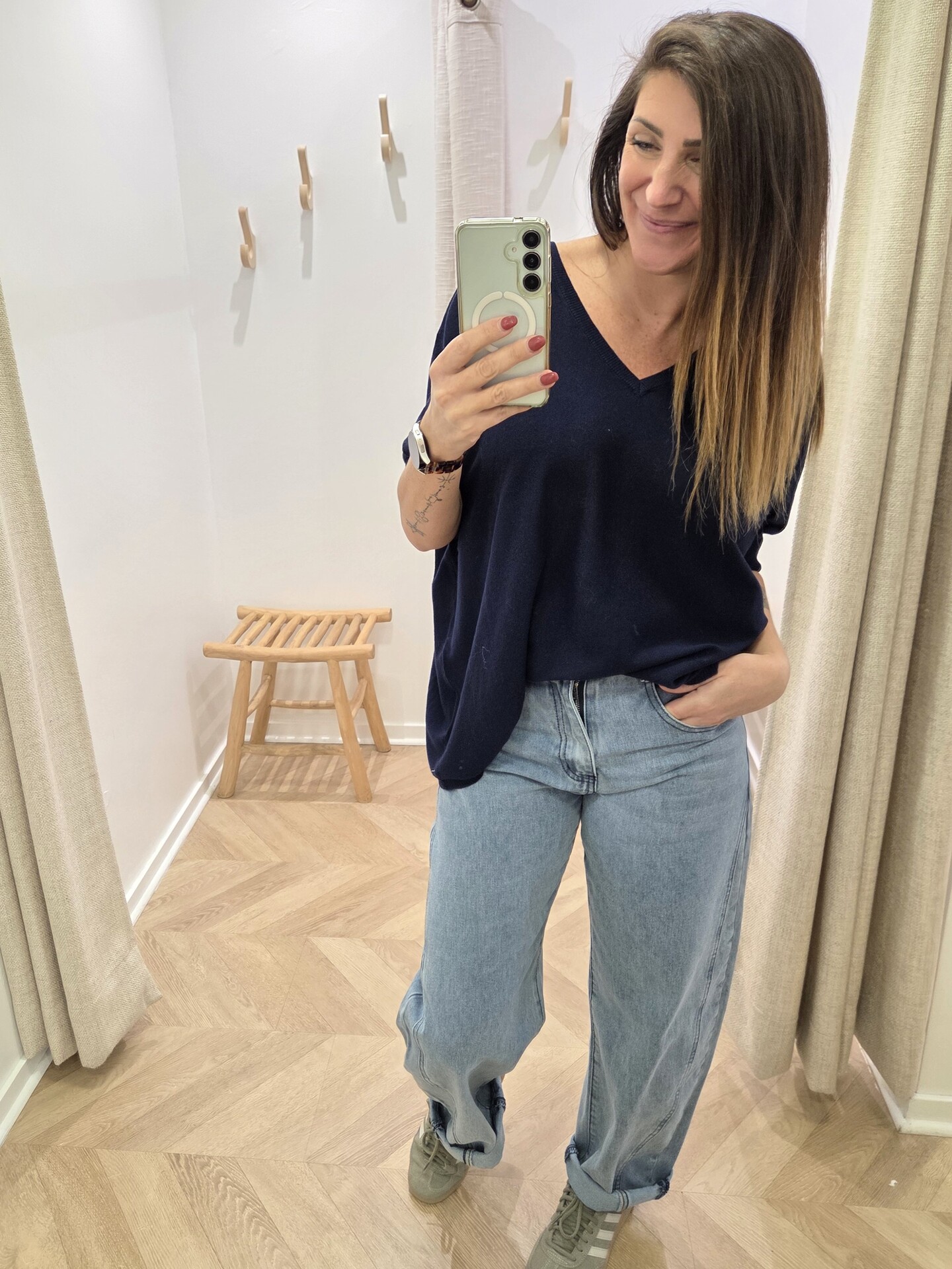 Son col V féminin, ses manches courtes et sa coupe souple en font un essentiel facile à associer. Il se porte aussi bien rentré légèrement dans un jean que lâché pour un rendu plus décontracté. Sur les photos, le pull Hesalia est porté avec le jean Lali. Une association simple et efficace qui fonctionne à tous les coups.
