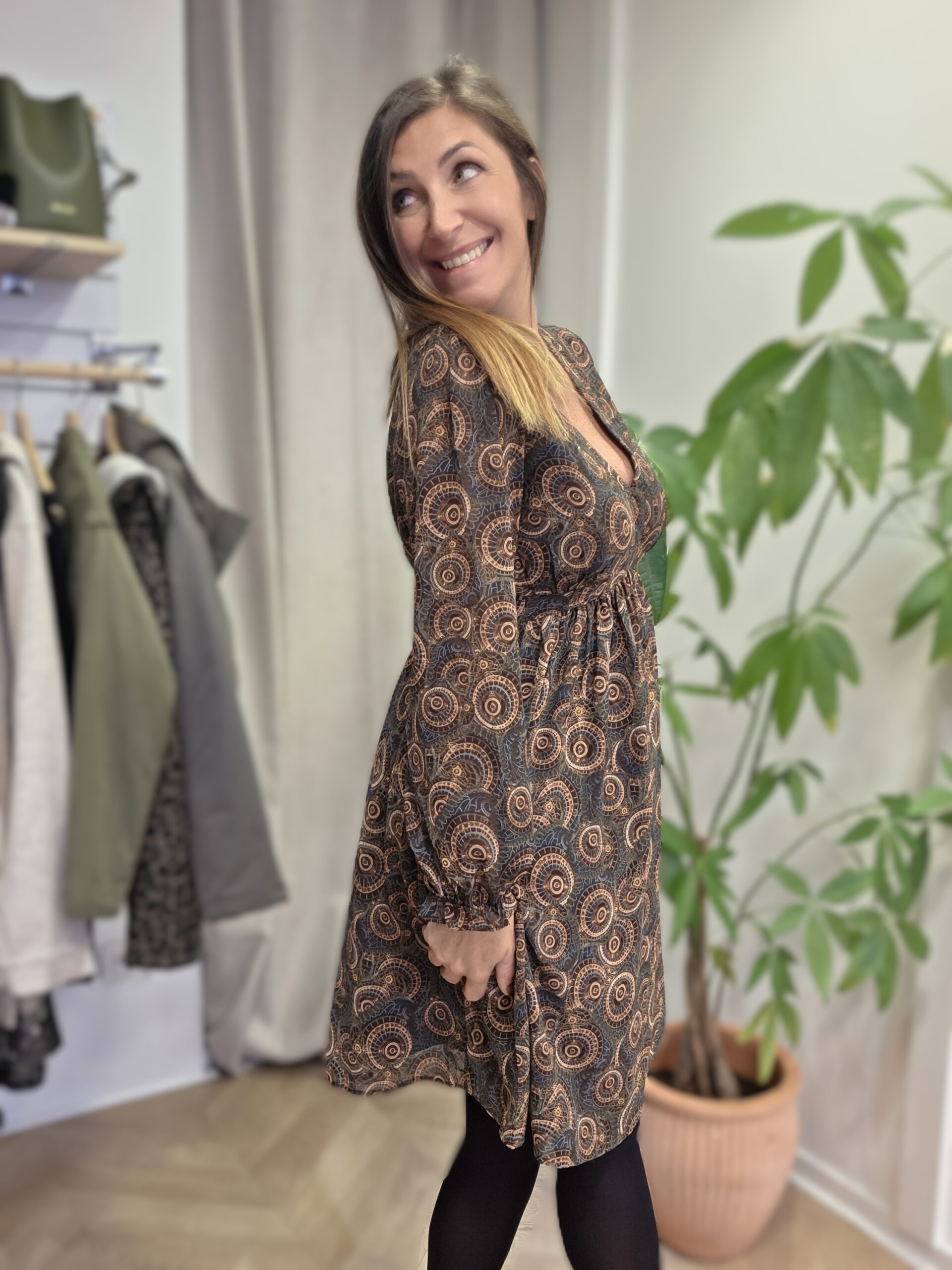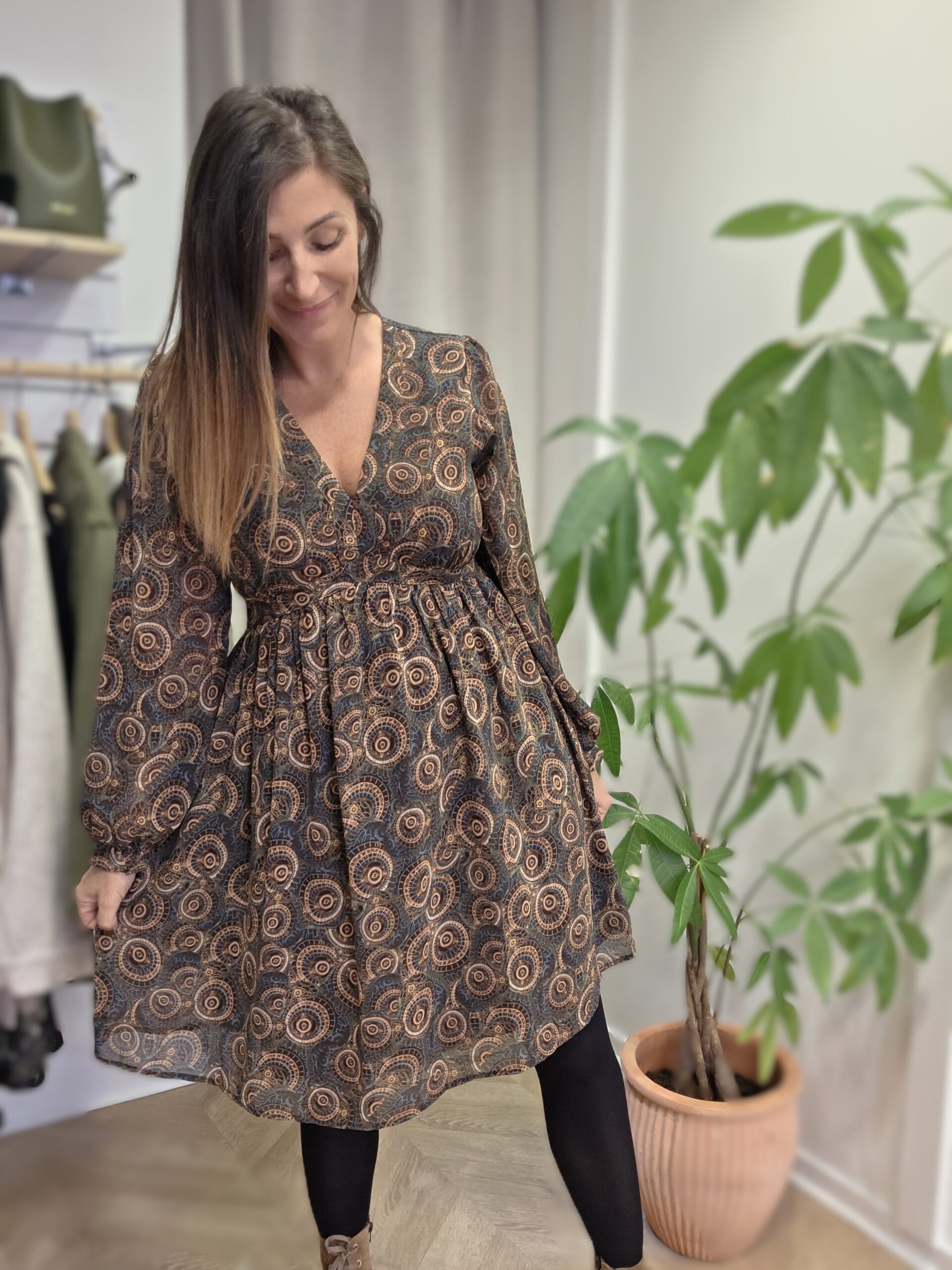 La robe Valentina est un vrai coup de cœur : une coupe fluide, un joli décolleté féminin et un imprimé bohème chic dans des tons kaki, marron et touches de bleu, parfait pour illuminer la saison. Sa doublure 100 % viscose, très agréable à porter, apporte un vrai confort tout au long de la journée.