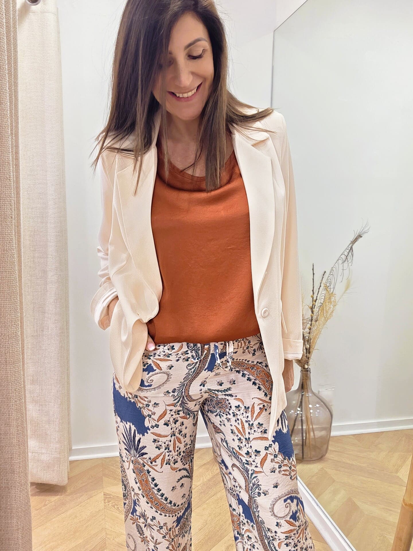 Sa coupe simple et épurée permet de le porter facilement au quotidien comme pour une tenue plus habillée. Sa couleur paprika réchauffe immédiatement un look et s’associe parfaitement avec le pantalon Giacomo et le blazer Amore.