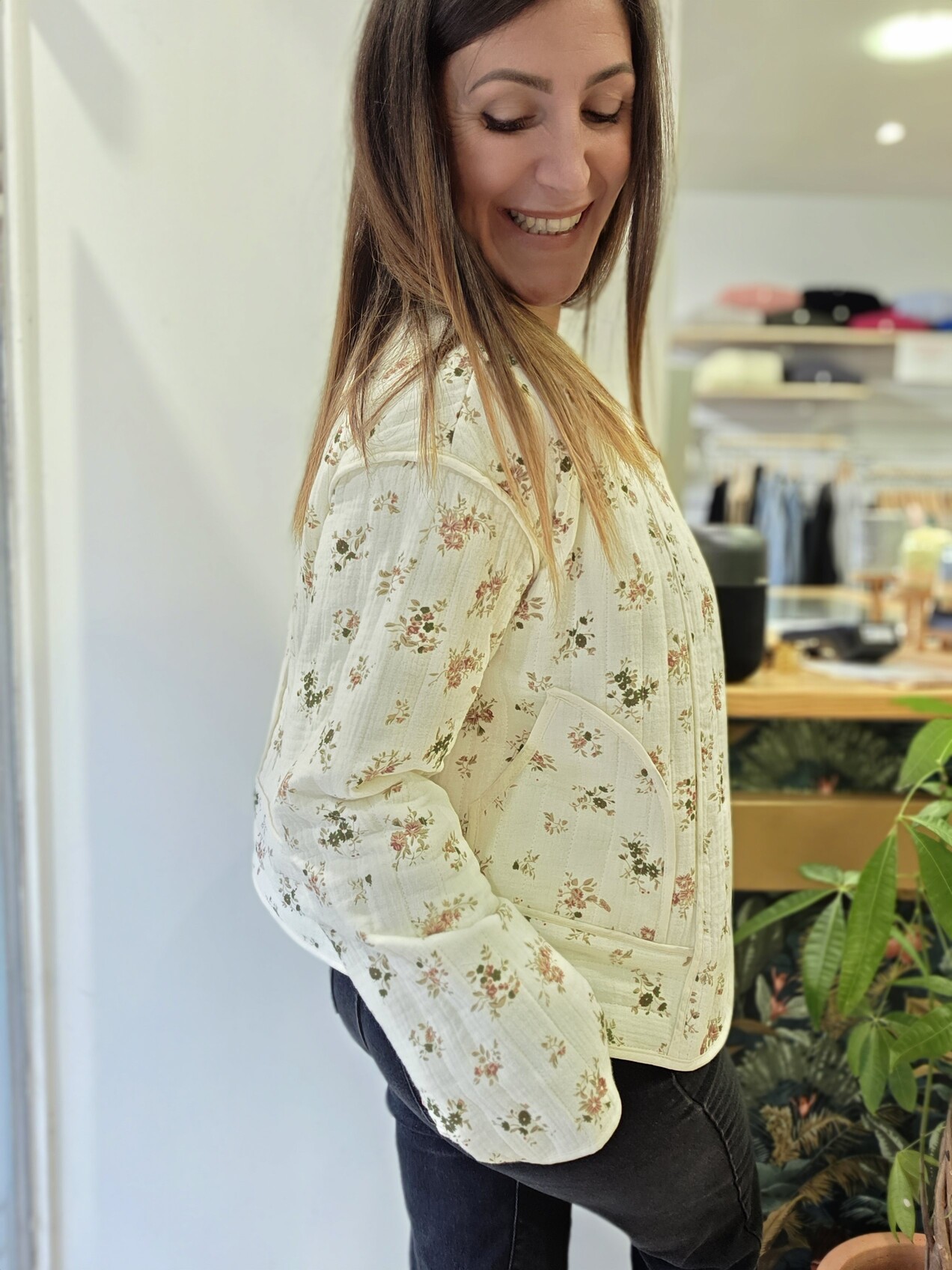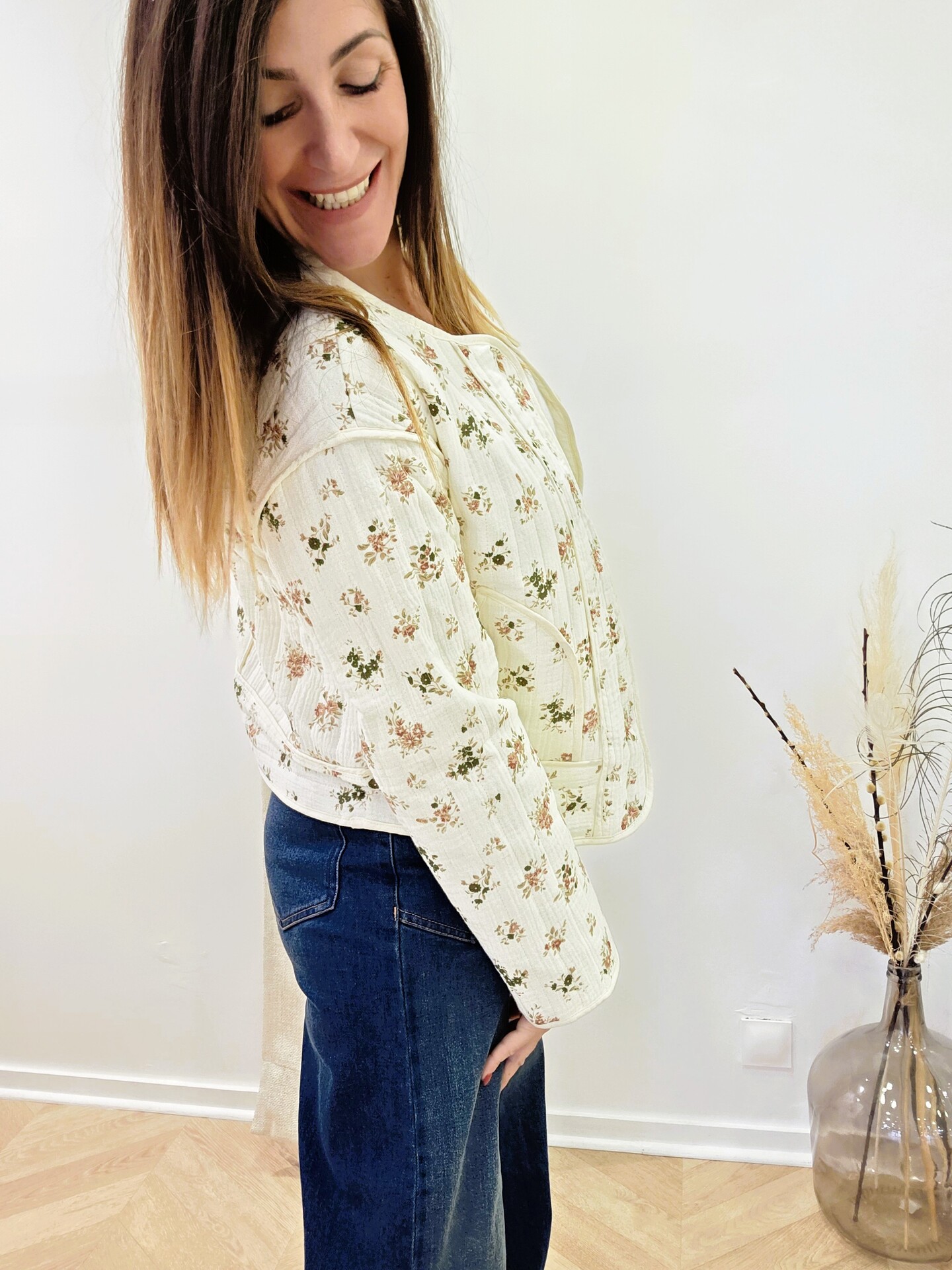 Son tissu 100 % coton est délicatement imprimé de petites fleurs aux tons naturels. Sa matière légèrement texturée apporte du relief, tandis que sa coupe souple et ses finitions arrondies lui donnent un tombé fluide et féminin. Les poches plaquées sur les côtés ajoutent une touche pratique et décontractée. Je porte ici la veste Cléo par-dessus la blouse Ambre pour un look doux et lumineux.