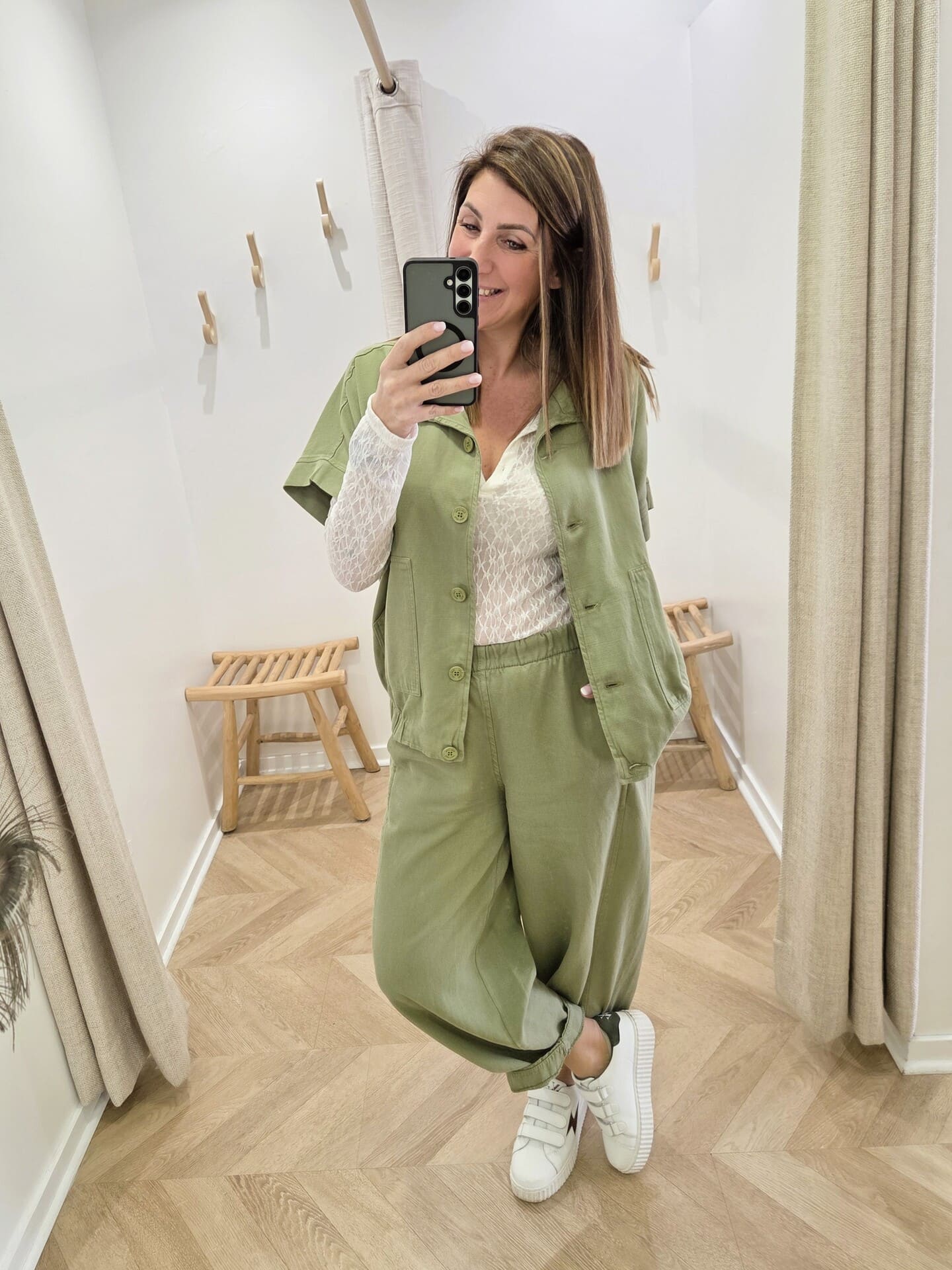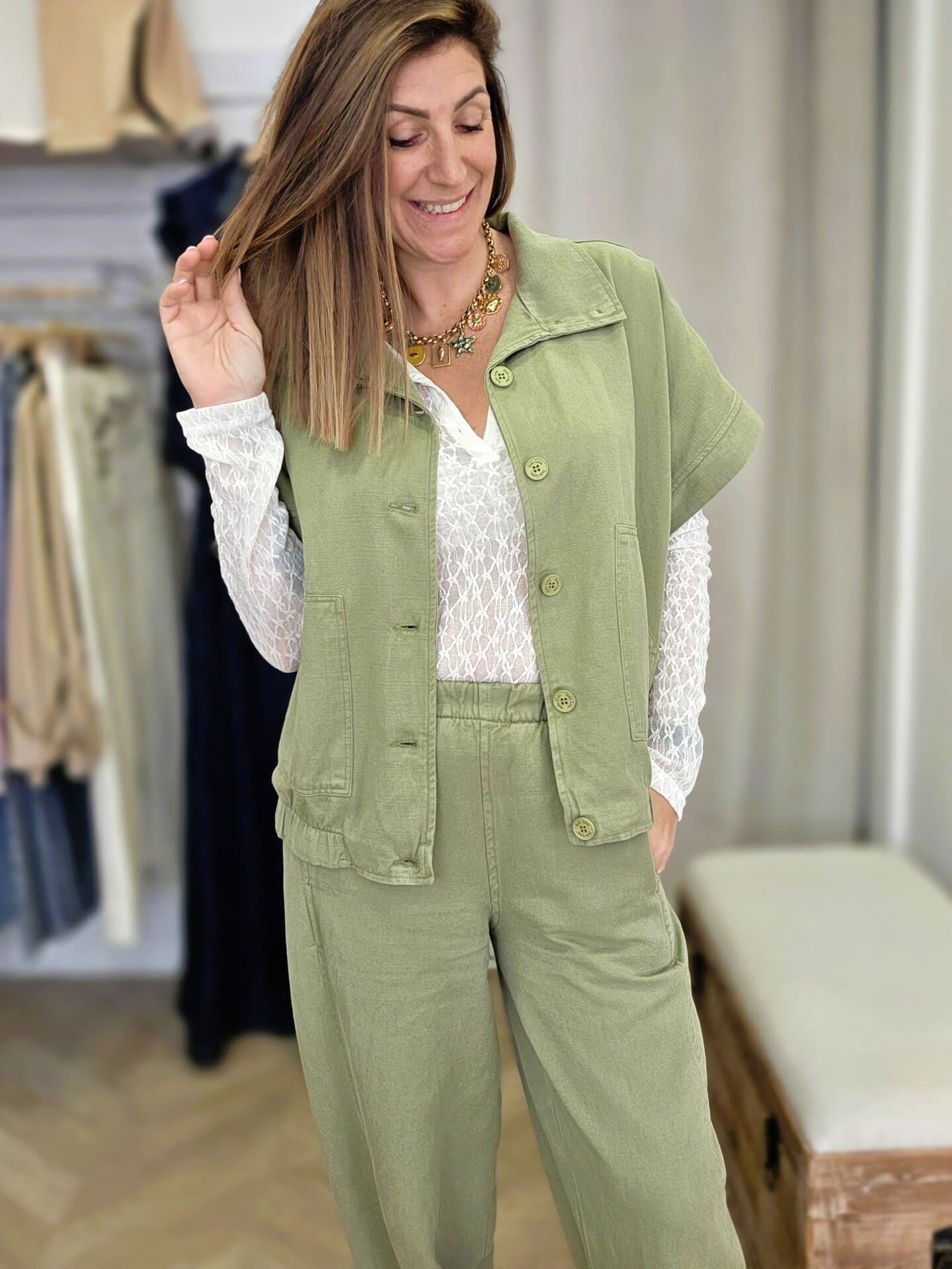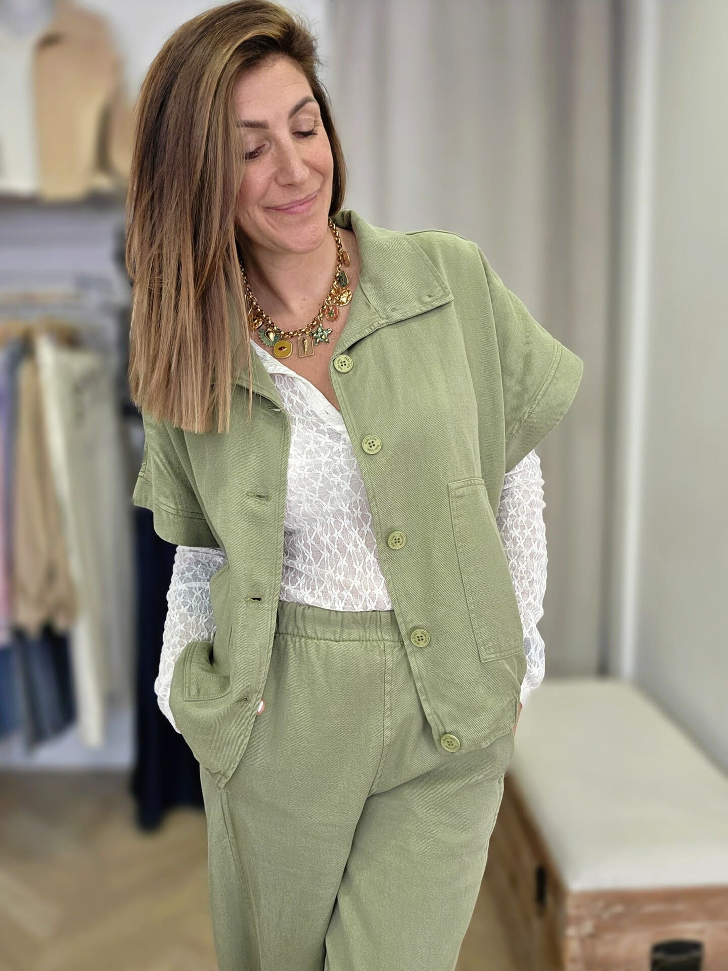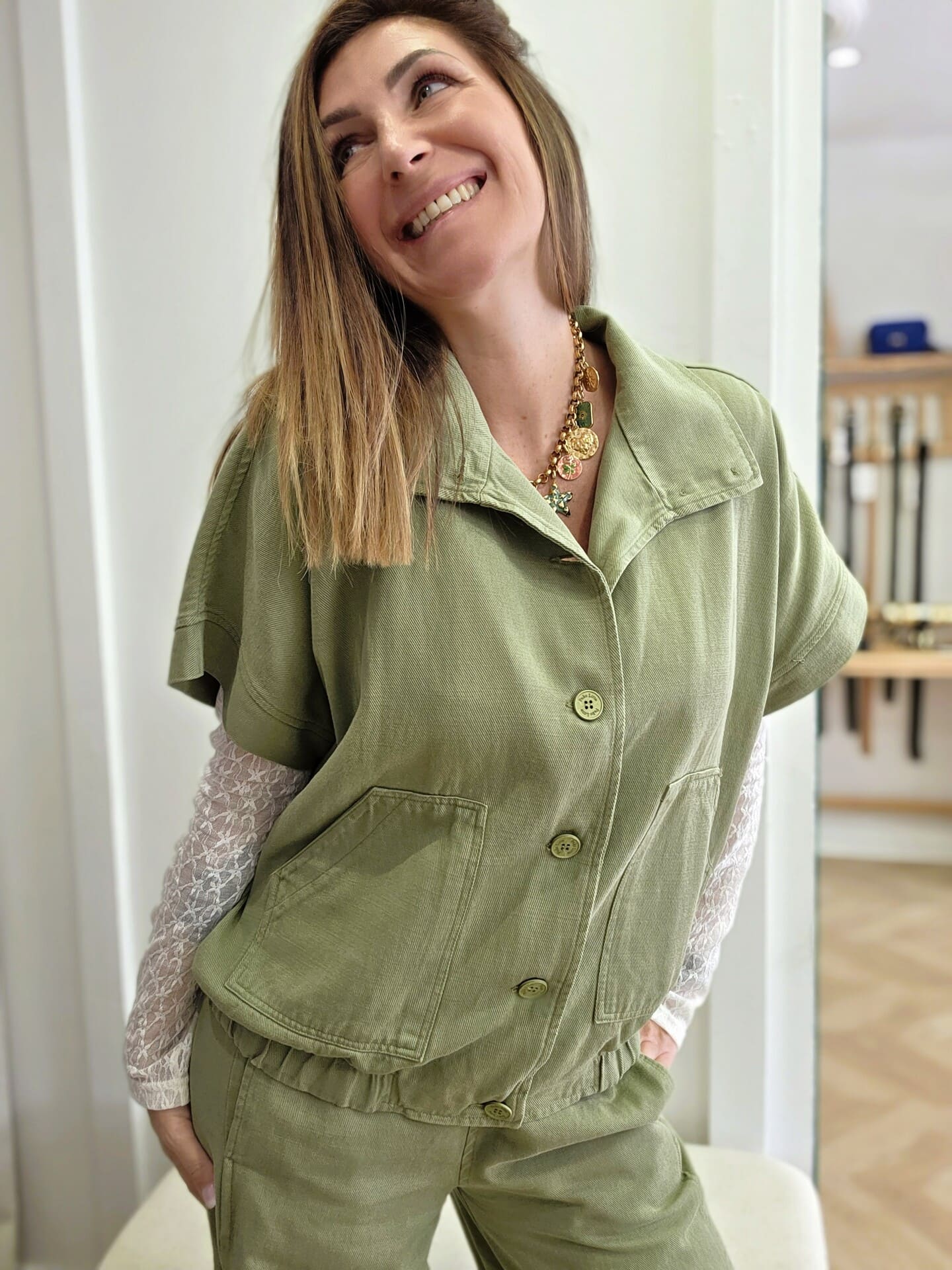 J’ai craqué pour cette veste à la coupe légèrement ample, avec ses manches courtes et ses jolis boutons sur le devant. Elle a ce petit côté décontracté qu’on adore, tout en restant soignée grâce à sa matière fluide et agréable.